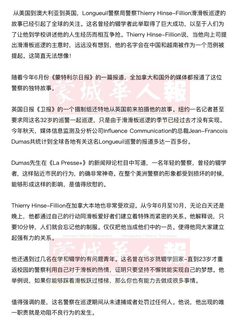 对于Longueuil警察局局长来说,这个试验性项目卓有成效。Fady Dagher指出,此项目明年将会升级,但目前还不知道会采用什么样的形式;他还补充说,其他警察也表示有兴趣参与此项计划。 今年冬天,Thierry Hinse-Fillion将到各个学校去做报告。Brossard市Dix30商业区的滑板乐园Spin Skatepark联合业主Stéphane Vallée总结道,如果这样做可以改变警察的形象,同时给滑板乐园带来更高的知名度,那就太好了! |