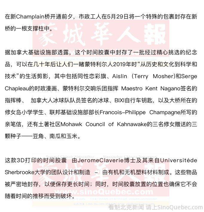 这不是蒙特利尔地区的桥梁第一次获赠这样的礼物。1926年,一个带有时间胶囊的基石被放置在靠近 Jacques-Cartier桥的一个码头上。