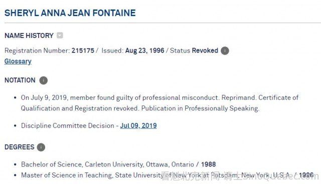 上个月,安省一名高中教师被安省教师学院吊销了执照,理由是她和学生有“不恰当的私人关系”。在网上公开的官方声明称,作为一名教育工作者,她依靠自己的权威和信任,对学生提出性要求。 图片来源:Dids / Pxels 这位名叫Sheryl Anna Jean Fontaine的教师没有出席听证会,但是派了律师前往。在此之前,Fontaine对八项违规行为没有提出异议,其中包括对一名学生的性剥削和对一名学生的心理虐待。 图片来源:oct.ca 学院称,Fontaine与学生不正当关系开始于2014年至2015年,学生在上9年级。Fontaine向学生提供酒精饮料,要求女生和她在教室里度过午餐时间,而且没有向学校报告学生的个人情况。后来在一次无关学校的活动上,女生的父母住在一个酒店房间,这位女教师和女生住在了另一个酒店房间里。学院称,当时Fontaine 和学生睡在了一张床上,这是不恰当的接触。 在2015年初,当学校校长要求Fontaine只能就学业问题联系那位女生,Fontaine也没有听从,还给那位学生发短信,并且在推特上保持联系。实际上,Fontaine模糊了学生和老师之间应该有的边界,并且和学生有不正常的性接触,严重违反了她的职责。 图片来源:oct.ca 1996年起,Fontaine就一直在安省当老师. 曾经毕业于加拿大卡尔顿大学和纽约州立大学,她被吊销执照的时候,任教的地点是在多伦多东边的Brockville。