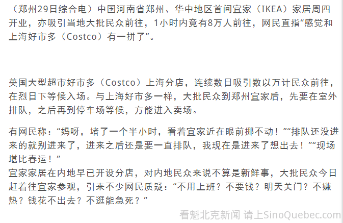 继日前美式卖场好市多在上海开幕,大批中国民众疯狂涌入卖场后,今天再度上演相同剧码,只是卖场换成了瑞典宜家家居河南郑州店。 综合媒体报导,今天瑞典卖场宜家家居IKEA在河南郑州开幕,短短1小时内涌进了8万人,重现了前几日的卖场风潮。 与上海好市多开幕相比,IKEA从1998年开始进驻中国,在中国已有28家分店,不过郑州店的开幕,仍然吸引大批人潮。 虽然IKEA应付人潮较有经验,但由于排队实在太久,许多现场顾客大太阳下排了3个小时的队才进去,也有顾客多次冲开人墙,1名维持秩序的民警也被人流推倒了2次。 有中国网友对此笑称,"我去晒太阳、看人的"、"比春运还夸张"。 近日,河南郑州宜家商场曾发布通知,称8月28日会员可以提前进店选购。 但28日大批顾客赶到之后却发现被放了鸽子,要29日才会营业。 面对突如其来的“鸽子”,不少顾客大呼失望,并齐声高呼:宜家,骗子! 宜家,开门! 对此,荔枝新闻致电宜家客服,对方表示确实曾发布相关通知,但会员日活动已取消,抱歉没通知到位。 相关报道: 日前美式卖场好市多在上海开幕引爆旋风,大批中国民众前仆后继涌入卖场,让好市多营业首日就不得不提早结束营业,第二天开始进行「人流管制」,热卖的烤鸡更是一人限购1只,类似的情况今(29)日再度上演,瑞典宜家家居IKEA在河南郑州开幕,短短1小时竟然就涌入8万人。 综合陆媒报导,来自瑞典的IKEA从1998年开始进驻中国,在上海开设第一家分店,相较于好市多可说是很早就进驻中国,而郑州的第一间店也在今日开幕,虽然IKEA在中国已经有20多家分店,但郑州店的开幕同样引发排队人潮,挤爆的情况丝毫不输上海好市多。 网友看到这夸张的情况纷纷留言,「中国人就是爱凑热闹」、「完全不意外」、「有钱人比我想得还闲」、「人家不用上班还比你有钱」、「疯了吗?东西不用钱?」、「明知道人多还去」,还有网友提到,当时郑州第一间星巴克开幕时,同样挤满了人潮,不只排队排超长,买到后因为没座位大家就蹲在路边喝咖啡,直说大家应该减少「从众消费心理」。 IKEA开幕首日光是挤进门就得花3小时,商场里头更是满满人潮,从排队到点完餐至少也花2小时,即使IKEA在队伍挂上「温馨提示」,写着排队时间至少45分钟,民众依旧热情不减。