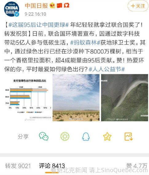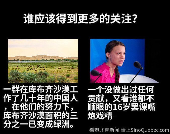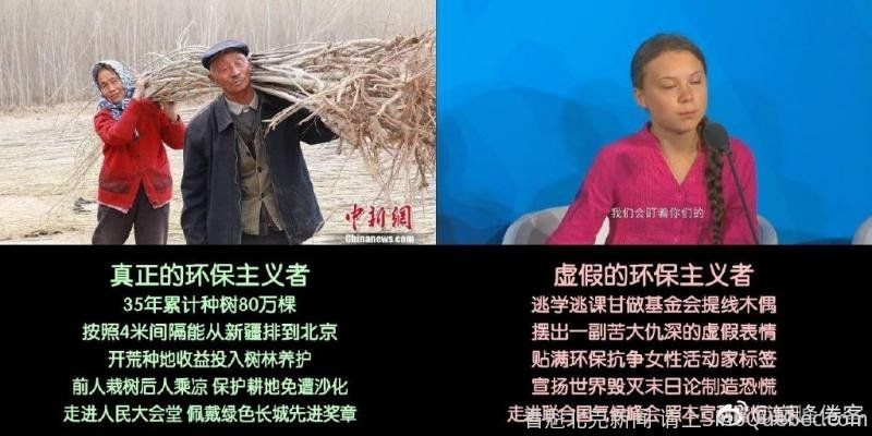本文转载自:暴走漫画(ID:ibaoman) 最近在国际上最火的年轻人,应该就是这位16岁的瑞典女孩格雷塔·通贝里了。 前两天,这位“气候女孩”再次登上了联合国气候峰会的舞台,向全世界领导人发表演讲。 她用歇斯底里的怒吼,和振振有词的质问,表达了对如今政界人士处理气候问题的不满。 她说“你们怎么敢这样!你们用空洞的语言,偷走了我的梦想和童年” 比这场演讲争议更大的是,她从欧洲抵达联合国总部的方式。 格雷塔拒绝乘坐耗油量大的飞机,而决定采用零碳旅行方式——乘坐一艘由太阳能电池板和水力涡轮机产生电力的赛艇。 最终她用时15天横跨大西洋,在一大群后援队伍的支持下,成功抵达了纽约。 然而外媒绝口不提的是,为了实现她的偏执梦想,后援团队多少人乘坐飞机商讨方案,造出这艘船的工厂又不知道要排放多少碳。 也就是说,由这次航行产生的碳排放、能源消耗,远远大于她乘坐飞机。 无论格雷塔的言论还是行为都在国内有很大的争议,但我万万没想到的是,网上居然会有人借着“气候女孩”来指责中国的环保事业。 事情是这样的。 在格雷塔的号召下,昨天,全世界3270个地方的高中生一起罢课。 他们的诉求只有一个,那就是逼迫世界各地政府采取措施,对付全球气候变暖。 这场罢课也被称之为“气候罢课”。 而中国大陆地区,也成为全世界少数没有参与这场活动的地方。 于是,这就成了一部分人攻击中国的把柄,说我们是“人海中的孤岛”,还把我们学生说成是“两耳不闻窗外事”的书呆子。 说实话,看到这番言论,我真的很生气。 中国人在环保事业所做出的贡献,不敢说世界第一,也至少是全球领先了。 但凡看过这张对比图的人,都不应该指责中国人在环保事业上做出的贡献。 这是一组沙漠的卫星对比照,分别是2000年和2016年的库布齐沙漠。 库布齐沙漠位于内蒙古的鄂尔多斯,是离北京最近的一个沙漠。 这个沙漠腹面积超过1.8万平方公里,地深处寸草不生。 与如今沙海中郁郁葱葱的景象不同,30年前的库布齐沙漠是名副其实的沙漠,森林覆盖率不到1%,动物几乎绝迹。 在这个沙漠上,人能够活着就已经是一个奇迹了。 然而,中国人却还想改变被沙漠赶着跑的日子,从30年前开始,中国人想尽了各种办法防风固沙。 经过了一代又一代人的努力,“沙漠变绿洲”不再是一个神话。 如今,这里的森林覆盖率、植被覆盖率已分别由2002年的0.8%、16.2%,提升到了2016年的15.7%、53%,每年阻止上亿吨黄沙流入黄河。 像这样的奇迹,中国不止有库布齐沙漠。 曾经寸草不生的毛乌素沙漠,正是靠着一代又一代的治沙人前赴后继,在这荒芜人烟的地方贡献了自己的一生,如今这里已经水草丰茂。 你能想象这里曾经是一片荒漠吗? 塞罕坝曾是一片荒漠的广阔土地,经过55年两代人的不断努力,如今已经是世界上最大的人工林。 112亩,两代人的接力,让这一片寸草不生的荒漠变成了风景优美的森林。 小学的时候,我还经常能看到新闻,一年一次的北京刮沙尘暴,印象十分深刻。 但慢慢地,也不知道从哪一年开始,再也看不到北京的沙尘暴新闻了。 感谢这些伟大的护林人,是他们的坚守,让中国一点一点变好。 不过这群讥讽者有一个词是说对了,我们在环保事业上,的确是“孤岛”。 今年2月,NASA发布了一张世界地图。中国在这张地图上,是一个孤岛,一个绿色的孤岛。 美国研究人员通过检视NASA卫星在2000年至2017年期间收集的遥感数据发现: 全球绿化面积“逆势上涨”增加了5%,而对此作出主要贡献的是中国和印度,其增长贡献高达三分之一。 而值得注意的是,中国新增绿化42%来自于植树造林,32%来自于农业。 而印度新增的绿化面积则主要来自农业,占比高达82%。 也就是说,为全球绿化做出最重要的两国国家里,印度是靠农业,而中国则靠的是森林。 上过初中地理课的人都知道,农业绿化和森林绿化完全是两个概念。 所以说,中国成为了世界上唯一一个对全球绿植绿化有主要贡献的国家。 这样的一组数据,让NASA直言“违背直觉”。 因为在人们的刻板印象中,发展中国家,尤其是人口众多的发展中国家,往往会因为过度开发,而是绿地退化。 但中国却做到了不一样。 除此之外,中国人环保的数据还有很多。 我国荒漠化土地面积从20世纪末年均扩展1.04万平方公里转变为目前的年均缩减2424平方公里,沙化土地面积由20世纪末年均扩展3436平方公里转变为目前的年均缩减1980平方公里。 2014年,我国累计风电并网装机容量已经达到9637万千瓦,这一规模占全球风电装机总量的26%。 中国的太阳能发电有三个世界第一:太阳能制造业世界第一,太阳能发电装机量世界第一,太阳能发电量世界第一。 我国核电在建规模居世界首位,已经成为世界最大的核技术利用国家之一。 除了数据,还有一个个鲜活的人。 新疆一对倔强夫妇付志周和陈爱兰,35年种树80万棵,按照两棵树间距4米计算,这些树排队可以排到北京。 石家庄贾海霞和贾文其,一人双目失明,一人没有双臂,十几年来,他们互为手眼,植树上万棵,将50多亩的荒滩变成了绿洲。 讥讽者还可能会说,这些都是那些人的努力,和多数中国人又有什么关系? 任何一个在中国教育体系下学成长大的孩子,一定都记得,我们从小学到大学,只要是有跟地理、气候、环保相关,课本上一定会教育我们,我国的荒漠化形势十分严峻。 而且更重要的是,我们一定