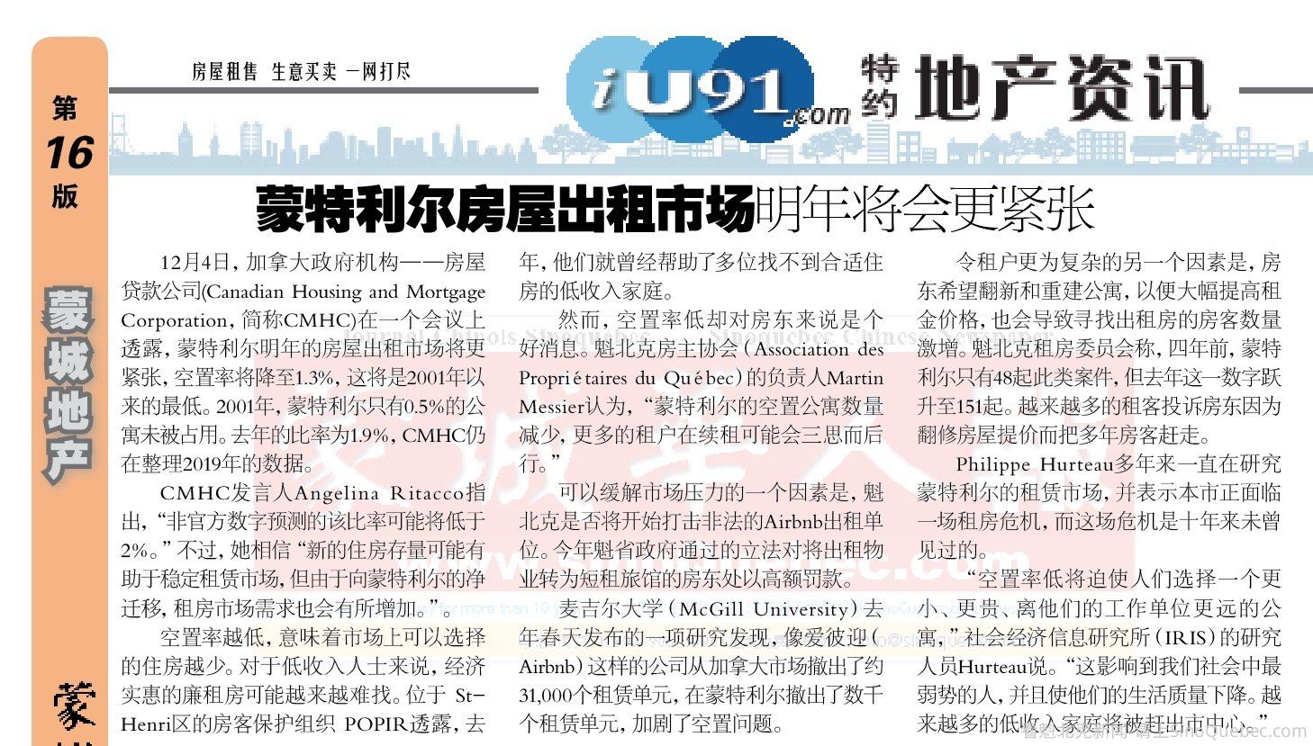 今天(周三),加拿大房屋贷款公司(Canadian Housing and Mortgage Corporation)的一个会议上透露,蒙特利尔明年的房屋出租市场将更紧张,空置率将降至1.3%,这将是2001年以来的最低。 更多内容请留意本周五出版的“蒙城华人报”。 |