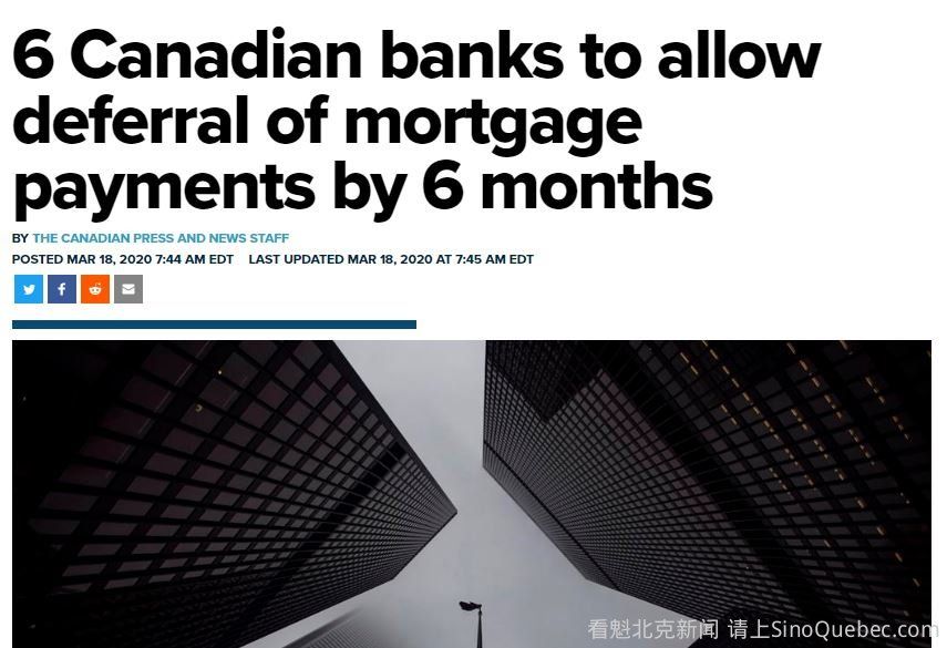 加拿大六大银行已宣布,将在冠状病毒大流行期间允许将抵押贷款付款推迟六个月。 蒙特利尔银行,CIBC,TD,加拿大国家银行 (National Bank of Canada),加拿大皇家银行 (Royal Bank of Canada),加拿大丰业银行 (Scotiabank)表示,他们的计划将帮助那些受到COVID-19影响而出现财务问题的人。 银行表示,计划将包括最多六个月的抵押贷款延期付款,以及其他信贷产品的减免。 他们鼓励个人和小企业主直接与银行联系,讨论他们可以使用的选择。