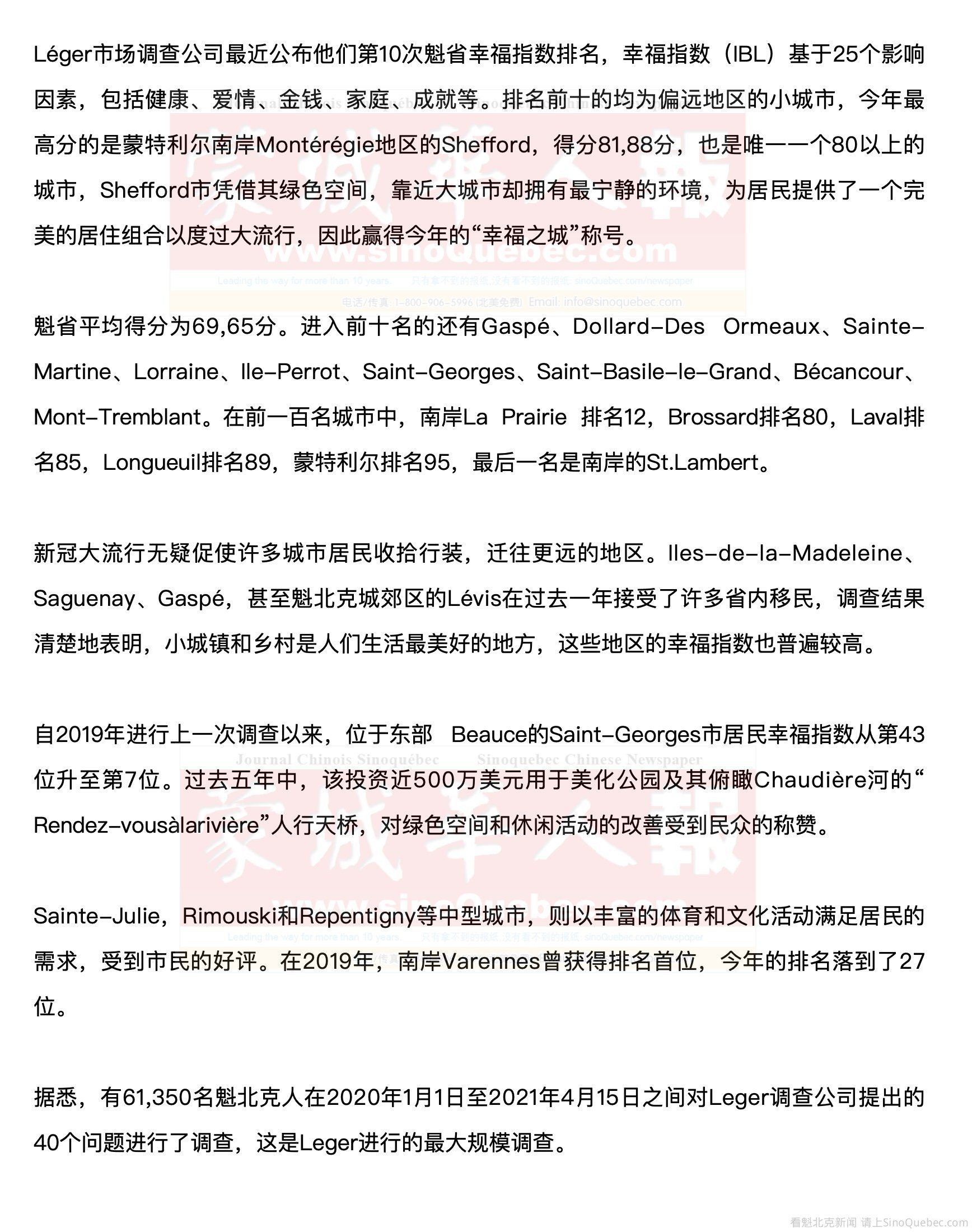 魁省100个城市的幸福指数 魁北克IBL平均数 69,65 1 Shefford 81,88 2 Gaspé 79,76 3 Dollard-Des Ormeaux 78,07 4 Sainte-Martine 77,68 5 Lorraine 76,80 6 L’Île-Perrot 75,42 7 Saint-Georges 75,41 8 Saint-Basile-le-Grand 75,37 8 Bécancour 75,37 10 Mont-Tremblant 75,25 11 Alma 75,01 12 La Prairie 74,89 13 Val-d’Or 74,67 13 Saint-Sauveur 74,67 15 Cowansville 74,53 16 Rimouski 74,49 17 Nicolet 74,37 18 Salaberry-de-Valleyfield 74,14 19 Joliette 74,09 20 Saint-Bruno-de-Montarville 74,06 21 Baie-Comeau 73,94 22 Sainte-Marguerite-du-Lac-Masson 73,89 23 Sainte-Sophie 73,69 23 Bromont 73,69 25 Thetford Mines 73,65 25 Lavaltrie 73,65 27 L’Assomption 73,32 27 Varennes 73,32 29 Acton Vale 73,30 30 Granby 72,84 31 Mille-Isles 72,69 32 Saint-Lin-Laurentides 72,68 33 Saint-Lazare 72,59 34 Mont-Saint-Hilaire 72,51 35 Sept-Îles 72,45 36 Blainville 72,40 37 Saint-Hyacinthe 72,38 38 Mirabel 72,35 39 Mercier 72,25 40 Repentigny 72,21 41 Sainte-Agathe-des-Monts 72,18 42 Chambly 72,06 43 Victoriaville 71,87 44 Boucherville 71,83 45 Châteauguay 71,82 46 Shawinigan 71,80 47 Sainte-Julie 71,78 48 Belœil 71,67 49 Rosemère 71,62 50 Rouyn-Noranda 71,56 51 Saguenay 71,46 51 Magog 71,46 53 Saint-Charles-Borromée 71,37 54 Lévis 71,35 55 Pont-Rouge 71,34 56 Otterburn Park 71,29 57 Dorval 71,23 58 Saint-Colomban 71,19 59 Sainte-Thérèse 71,12 60 Sainte-Marthe-sur-le-Lac 71,07 61 Sainte-Adèle 70,96 62 Candiac 70,95 63 Prévost 70,88 64 Mascouche 70,83 65 Gatineau 70,76 65 Sherbrooke 70,76 67 Saint-Jean-sur-Richelieu 70,71 68 Trois-Rivières 70,70 69 Sainte-Anne-des-Plaines 70,59 70 Boisbriand 70,44 71 Saint-Eustache 70,41 72 Beauharnois 70,40 73 Sainte-Catherine 70,39 74 Lac-Beauport 70,05 75 Drummondville 69,99 76 Boischatel 69,96 77 Saint-Constant 69,82 78 Contrecoeur 69,81 79 Vaudreuil-Dorion 69,76 80 Brossard 69,73 81 Notre-Dame-des-Prairies 69,66 82 Pointe-Claire 69,55 83 Sorel-Tracy 69,51 84 L’Ancienne-Lorette 69,49 85 Rivière-du-Loup 69,32 86 Farnham 69,29 87 Laval 69,24 88 Québec 69,11 89 Longueuil 69,06 90 Mont-Royal 69,05 91 Saint-Augustin-de-Desmaures 68,98 92 Saint-Jérôme 68,67 93 Deux-Montagnes 68,57 94 Terrebonne 68,24 95 Montréal 67,71 96 Bois-des-Filion 67,54 97 Sainte-Marie 66,55 98 Wendake 63,41 99 Saint-Amable 63,09 100 Saint-Lambert 56,12 |