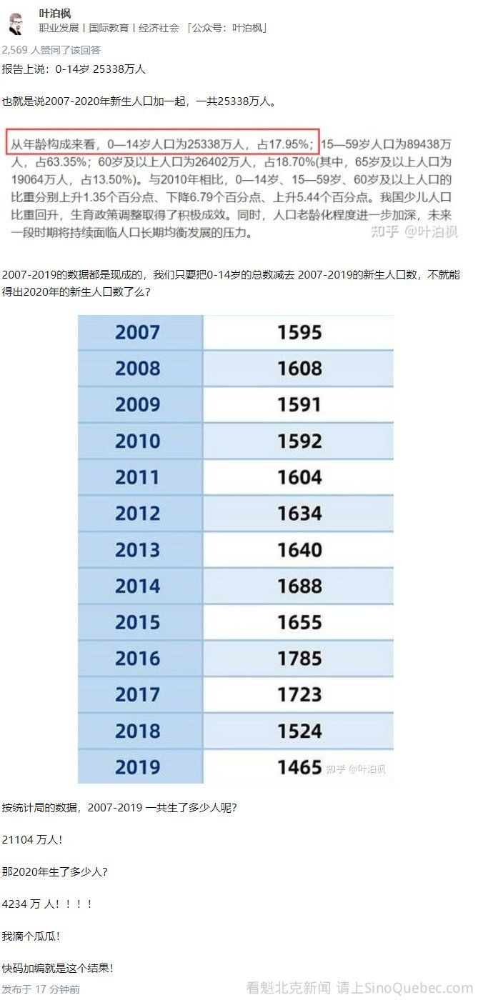 昨天(周一),中国公布了人口普查的数据,引起各方关注和点评。“知乎”网友对数据的准确性提出了质疑。