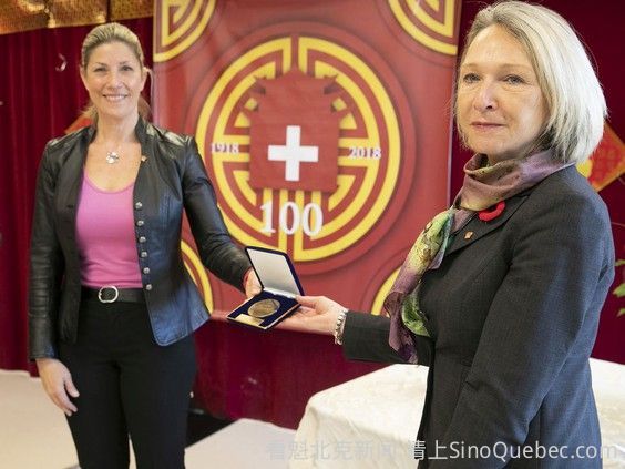 Westmount–Saint-Louis国会议员Jennifer Maccarone(左)于 2021 年 11 月 8 日星期一在蒙特利尔华人医院将国民议会荣誉勋章移交给 CIUSSS du Centre-Sud l'Ile-de-Montréal 的负责人 Sonia Bélanger。 PIERRE OBENDRAUF 摄/Montreal Gazette