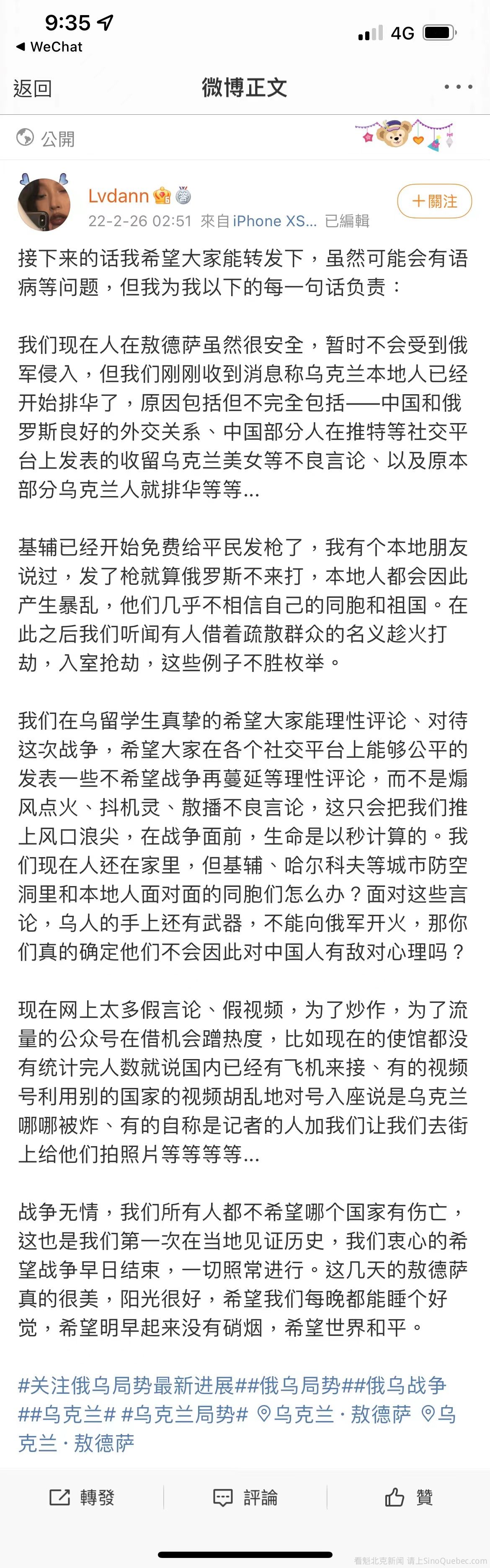 今日,多位在乌克兰留学的中国留学生发微博,希望国内舆论能克制。