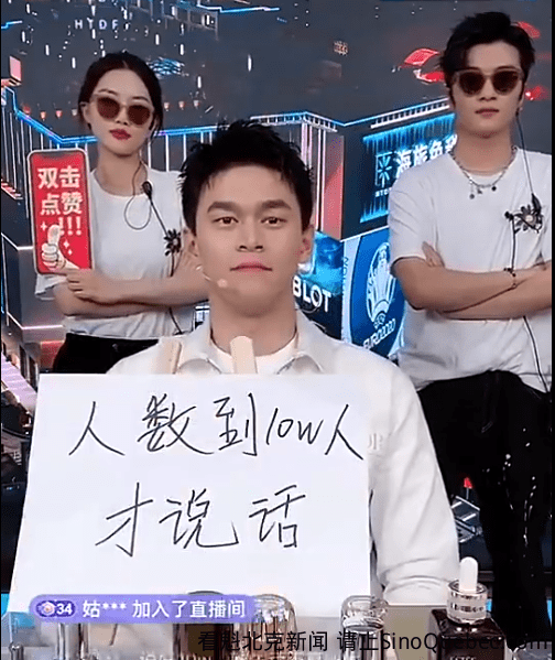 后来直播间人数超过3万时,有工作人员上来帮他摘掉了墨镜。