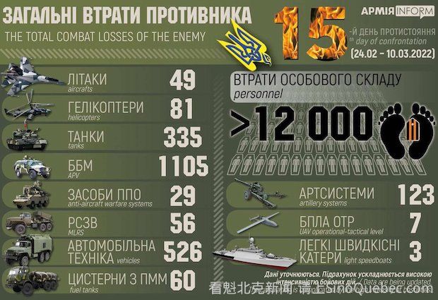 根据多家国际媒体整理。 - 乌克兰与俄罗斯外长在土耳其参加有土耳其参与的三方会谈刚刚结束。会谈没有成果,乌方不接受俄方开出的条件,俄方表示继续攻击。 - 美国警告俄罗斯正在为使用化学武器而撒布美军在乌克兰研发生化武器的假消息。 - 美国国会在昨晚通过向乌克兰提供136亿美元的援助法案。 - 俄军对马里乌波尔一家妇产科医院进行了空袭,造成多人死伤,伤者中包括孕妇。俄军的野蛮行为受到国际舆论谴责。 - 俄罗斯称将对撤出的外国企业留在俄罗斯的业务国有化。 - 乌方称俄军坦克军团司令官Andrei Zakharov在今天(3月10日)在基辅东的Brovary地区被击毙。这是开战以来第5位俄军高级指挥官被击毙。 - 加拿大在昨天宣布向乌克兰再提供5000万元的军事装备。这是开战以来加拿大向乌克兰提供的第四批军事援助。 - 乌克兰总统刚刚发推表示,乌军正在各个关键方向阻击俄军的进攻。 乌克兰方面公布的俄军战损: