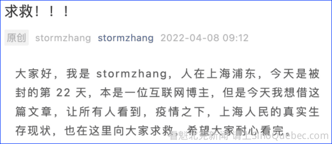 今天,有一篇题目是《求救》的文章刷屏了,作者是一个在上海浦东,被“封”在家的互联网博主 :stormzhang|求救!!! 作者说,之所以发这篇文章,是想让大家看到“疫情之下,上海人民的真实生存现状”。 在这篇文章中讲了上海一些居民家中生活物资短缺的问题。 文章作者说,全国各地的支援物资到了上海,政府也在努力发放物资,但是由于各种小区居委的管理调度能力参差不齐,目前存在一些小区物资短缺的现象。 作者说自己“被封22天,期间一共收到小区发放的3天物资,大概每次可以解决两天的温饱,只是杯水车薪。”身边也有人“每天靠喝粥,吃泡面度日很久了。” 在这篇文章中,作者还讲了一个事情,就是“年轻人还好些,可以通过各种软件去折腾,然而很多老人手机都玩不明白,指望他们线上抢菜更不可能了。” 这篇文章在自媒体迅速刷屏。 到下午的时候,文章被删了,是那个熟悉的“接相关投诉,……”