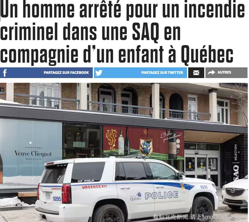 据称,今天上午一名 39 岁的男子在一名儿童的陪同下,试图在魁北克市向一家SAQ商店放火而被捕。 应急服务部门在10:38分左右接到报警,警方赶到Montcalm地区Cartier大街的一家SAQ商店。 据魁北克警察局(SPVQ)称,当消防员到达时,入口门廊墙上的“起火点”已经被扑灭。 根据现有信息,损害似乎有限。没有人受伤。 警方以纵火罪逮捕了一名 39 岁的嫌疑人。他被带到Victoria 警察局接受讯问。 SPVQ 发言人David Pelletier说: “在事件发生期间,有一个孩子和这个男人在一起。 孩子被警察接走了。 我们目前正在将孩子移交给可信任的人”。 目前无法确定男子纵火的动机。 Pelletier补充说,青少年保护组织DPJ 可能会被要求确保采取后续行动。