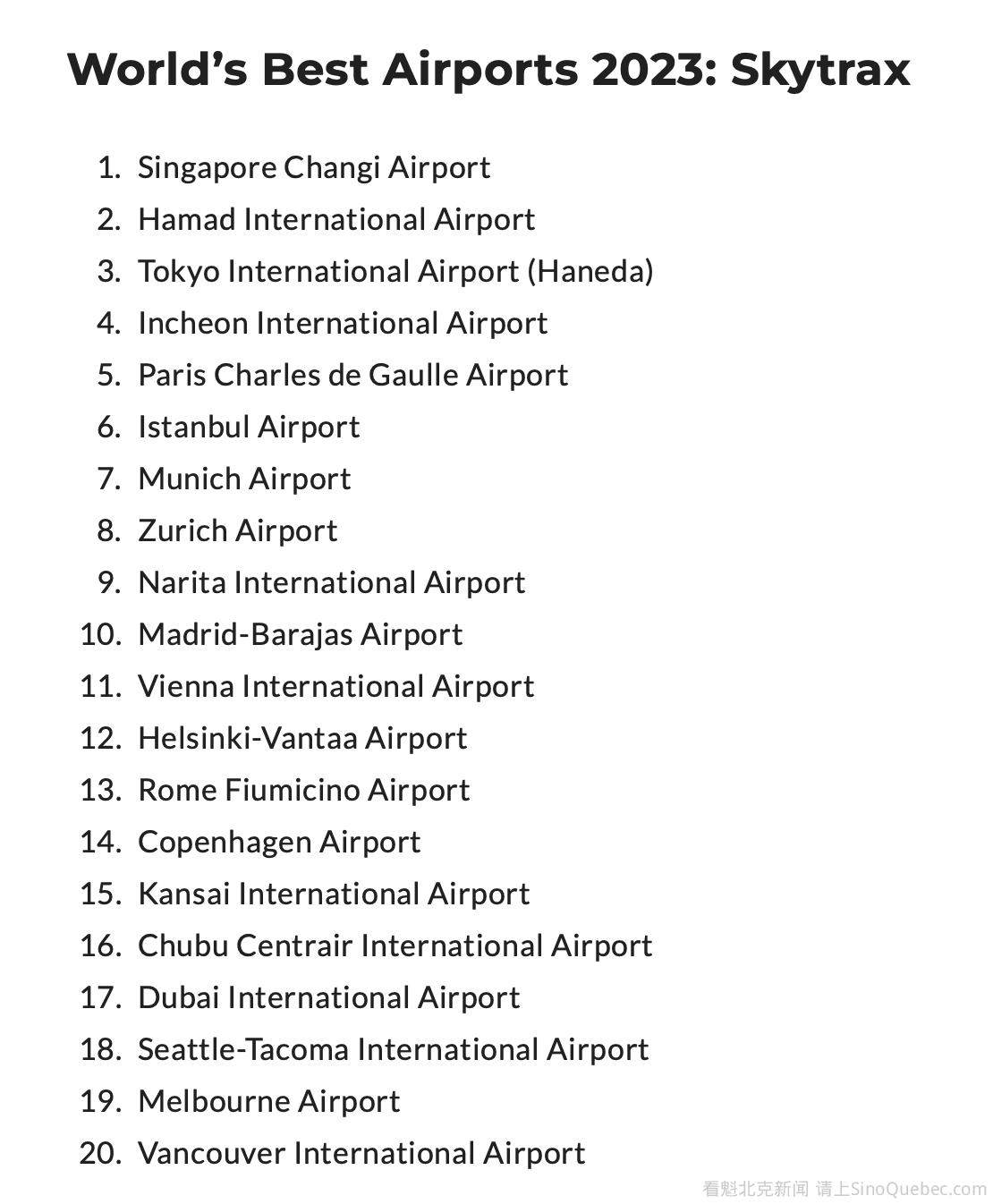 蒙特利尔特鲁多国际机场 YUL 被 Skytrax 评为全球最好的机场之一。 Skytrax 在对世界各地的旅行者进行调查后评选出全球排名前 100 的机场, YUL 排名第 45 位,比去年同期上升了 21 位。 温哥华机场排名第 20 位,是加拿大最好的机场。新加坡 Changi 机场被评为世界最佳机场,其次是 Hamad 国际机场和东京国际机场(Haneda)。 更多详情请点击这里查看。 |