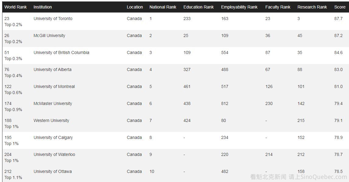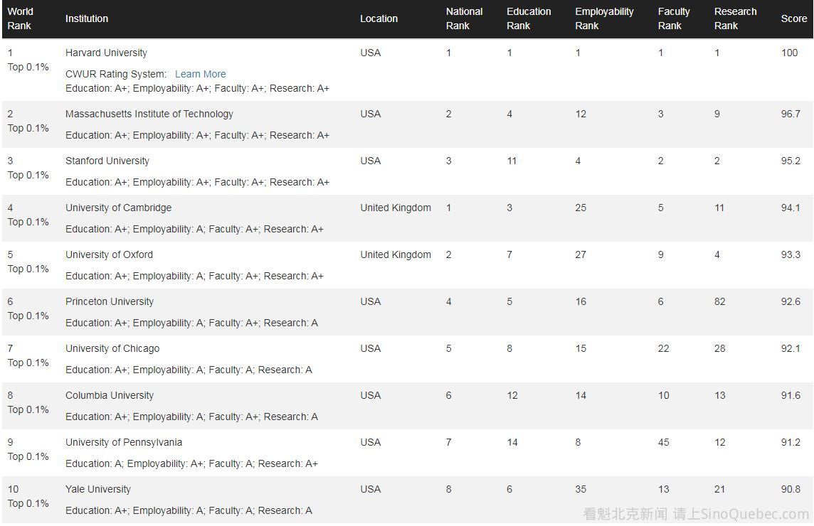 近日世界大学排名中心(The Center for World University Rankings, CWUR)发布2023世界大学排名,哈佛排名第一,麻省理工,史丹佛,剑桥,牛津分列2至5位。加拿大排名最高的是多伦多大学,位列23,麦吉尔排名第26。中国的清华大学排名第44,北京大学排名第49。 CWUR根据教学品质(25%),毕业生就业(25%),师资质量(10%)以及研究表现(40%),四大数据对世界各地20,000所大学进行评估。 与US News大学排名不同,CWUR排名的特殊之处在于不从学校提供的数据来判断,相对客观有力,整体排名具一定权威性。 全球排名前十: 加拿大排名最高的是多伦多大学(23),蒙特利尔麦吉尔大学比去年上升两位至26位。 加拿大排名前十: 亚洲最好大学是东京大学,全球排名第13,中国的清华大学排名第44,北京大学排名第49。 |