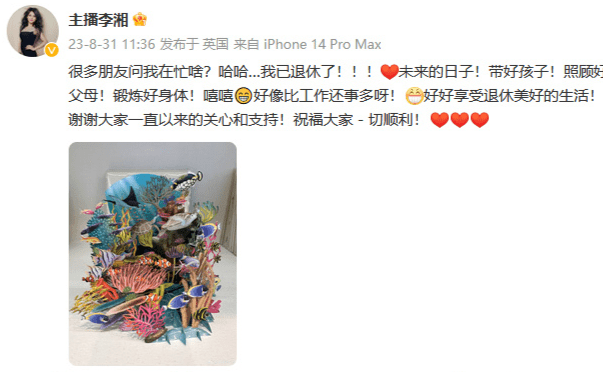 李湘已经退休了?47岁的李湘突然发文,说自己已经退休了。李湘以后的打算是:“未来的日子!带好孩子!照顾好父母!锻炼好身体!嘻嘻,好像比工作还事多呀!”你们羡慕吗?大家一定要说实话。 ![]() 第一个问题:李湘47岁就退休了? 说起李湘,大家都知道她是顶级女强人,过去是芒果台的一姐,1997年主持湖南卫视《快乐大本营》。2003年获得央视索福瑞收视调查全国卫视最受欢迎主持人第一名。后来玩直播带货,生意做得很不错。李湘从大学开始就很有财商,后来做主持人更是积累了不少。在很多人印象里,李湘还很年轻,可是李湘突然发文说,自己已经退休了。 ![]() 李湘说,自己已经退休了,生活很精彩。不少人觉得,李湘这么年轻就退休了,实在太可惜,她完全可以发挥余热,多做一些工作。不过李湘现在收入不低,应该早就赚出来退休的钱了,生活既然没有压力,不工作岂不是很好? ![]() 第二个问题:李湘退休后做什么? 很多人好奇,李湘退休后要做些什么?看李湘的IP地址,目前显示是英国。大家都知道,王诗龄现在去英国贵族学校读书了,住的宿舍还是安妮公主当年的那间。 ![]() ![]() 李湘对王诗龄一直十分宠溺,之前就专程送王诗龄去英国读书,怕孩子一个人生活不习惯,还专门陪了孩子一段时间,后来才回国。本来大家觉得李湘回国后会努力赚钱,但是李湘其实并没有压力,反而直接选择了退休。想必李湘以后就会在英国生活,陪伴女儿了。 ![]() 李湘给自己安排了三个任务:首先就是,带好孩子,这一点李湘已经做到了。其次是照顾好父母,李湘在英国,不知道父母是不是也接过去了。最后是锻炼好身体!没有好身体,其他都谈不上,李湘估计会更加努力运动吧。 |