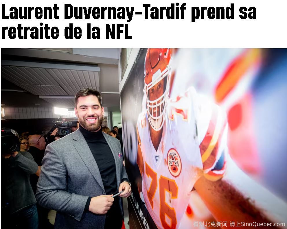 魁北克橄榄球运动员Laurent Duvernay-Tardif将在 NFL 效力九个赛季后退役。 他将于下午 2 点在Percival-Molson体育场举行的新闻发布会上正式宣布这一消息。 Duvernay-Tardif在堪萨斯城酋长队成名,他在堪萨斯城酋长队效力到 2021 年,然后被交易到纽约喷气机队。他效力酋长队时,在迈阿密对阵旧金山 49 人队的比赛中作为首发右后卫赢得了第 54 届超级碗。 在 NFL 打了 79 场比赛,其中 71 场作为首发。 2020年,他被《体育画报》评为年度最佳运动员。