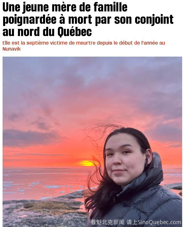 据称,一名 24 岁的年轻母亲周一在魁北克省北部被伴侣刺死,成为今年Nunavik发生的第七起谋杀案受害者。 Nunavik警察局负责刑事调查的Patrice Abel指出:“对于人口不多的地方来说,这里存在很多暴力事件。不幸的是,许多家庭暴力案件都在升级。” 案件发生在在Nunavik北部Ivujivik一个约有 350 名居民的小村庄Katsuak Iyaituk。 据我们了解,当天早上,这名 24 岁的年轻女子据称在家里被她的伴侣Adamie Paningayak刺死。 悲剧发生时,现场有两名年龄分别为 3 岁和 6 岁的儿童。此外,据报道一名14岁女孩目击了这一场景。 受害者在医院被宣布死亡。 24岁嫌疑人在屋内被发现,也受了重伤,根据初步调查,这是他自己造成的。 他被指控犯有预谋谋杀罪。 自一月以来,该地区发生了三起家庭暴力谋杀案,其中两女一男。 这也将是魁北克省今年发生的第六起女性被杀事件。