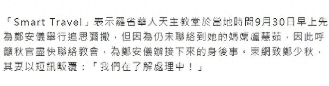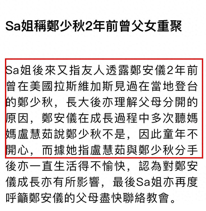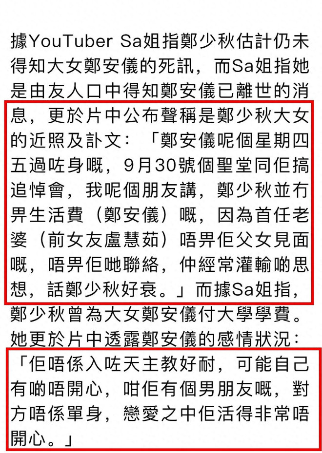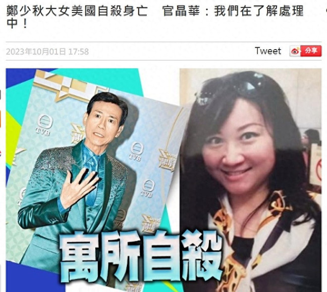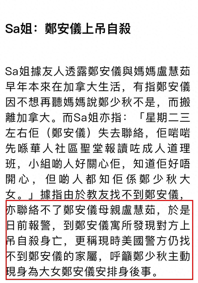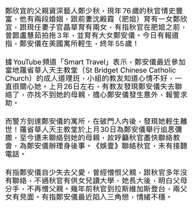 郑少秋(秋官)大女儿郑安仪传出死讯。 ![]() 相关报道如下: ![]() 郑少秋一共生育了四个女儿,他与前妻沈殿霞(肥姐)育有郑欣宜,与现任太太官晶华生了郑咏恩、郑咏曦,除此之外,他曾在演员训练班时期与卢慧茹相恋3年,女方在1968年为其诞下长女郑安仪。 ![]() 郑少秋与卢慧茹分手并不愉快,两人也从未公布过婚讯,外界估计秋官与卢慧茹没有领证。 分手后,卢慧茹带女儿出国生活,定居加拿大,在郑安仪的成长过程中,郑少秋介入较少,主要是卢慧茹不允许女儿与秋官见面。 郑少秋多年前受访时说,他曾供养女儿上大学,但女儿毕业后,二人就没有联络,当时秋官还感慨,可能双方在大街上遇见,他也认不出长女了。 据悉,郑安仪长大后对父亲已没有恨意,她反而因为母亲总是说郑少秋坏话而离开加拿大,定居美国。 两年前,郑少秋到美国拉斯维加斯登台演出,父女俩终于见面。 ![]() 10月1日,港媒报道,郑安仪早前在美国的寓所内上吊自杀身亡,终年55岁,教会在当地时间9月30日早上为她进行追思弥撒。 消息由视频网站的博主“Smart Travel”曝光。 据称,郑安仪生前有男朋友,但对方并非单身,她陷入三角苦恋,生活并不愉快。 ![]() 最近,郑安仪参加了当地华人天主教堂(St Bridget Chinese Catholic Church)的成人道理班,希望能够解开心结。 9月26日~27日,有教友发现郑安仪失联,由于联络不上她的母亲卢慧茹,于是报警求助,警方到达郑安仪寓所破门进入,发现她在屋内自杀身亡。 华人天主教堂于当地时间9月30日早上,为郑安仪举行追思弥撒,但因没能找到卢慧茹,故呼吁郑少秋尽快联络教会,为郑安仪处理接下来的身后事。 ![]() ![]() 对此,港媒联络郑少秋,秋官的太太官晶华以短信回复,“我们在了解处理中!” ![]() ![]() 今年76岁的郑少秋入行半个世纪,贡献了不少经典角色,从《书剑恩仇录》《楚留香》到《大时代》等等,以英俊潇洒、风度翩翩的古装侠士形象深入民心。 除了演技精湛,秋官的歌喉也十分动听,他演唱过不少经典名曲,举办过个人演唱会、音乐剧等等,可谓是影视歌三栖的实力男星。 秋官有三段公开的情史。 为人熟知的一段便是与沈殿霞(肥姐)维持了3年的婚姻,而在肥姐之前,他曾与拍拖3年的卢慧茹育有一女郑安仪,秋官迎娶台湾女星官晶华之后,生下两名女儿,便安定了下来。 郑少秋育有四名女儿,分别是:长女郑安仪(1968 年出生),次女郑欣宜(1987 年出生),三女郑咏恩(1990 年出生),四女郑咏曦(1993年出生)。 ![]() 郑少秋复杂的感情关系让他一度被推上风口浪尖,因“处处留情”被外界封为“世纪渣男”。 郑少秋曾在访问中透露与沈殿霞离婚的真正原因,否认官晶华是第三者。 秋官强调,他与肥姐并不是因为外遇而离婚,若不是真的有爱,他也不会与沈殿霞结婚,并指离婚是因为沈殿霞的性格太强势,他喜欢温婉的女生,才离婚收场。 ![]() 郑少秋是否好丈夫,外界没有发言权,但他对几个女儿绝对尽心尽责。 即使卢慧茹不让秋官与长女郑安仪见面,但他依旧供养女儿上大学,在外国上学的费用不少,大概是卢慧茹实在无法负担,所以才“开绿灯”让郑安仪与郑少秋联络。 然而,等到郑安仪完成大学学业,秋官便再度与长女失联。 次女郑欣宜8个月大的时候,郑少秋与肥姐沈殿霞离婚,肥姐与卢慧茹的做法正好相反,她从来不反对欣宜见父亲,还教导欣宜要尊重秋官。 沈殿霞更叮嘱郑欣宜每次回到香港一定要主动找爸爸,约爸爸吃饭,肥姐认为大人的事就是大人的事,不应该牵扯到小朋友的身上。 离婚多年后,沈殿霞曾邀请郑少秋上节目,她直接问对方,“这十几年里面,你到底有没有真正中意过我?” 郑少秋回答,“我真是好中意你,你真的对我好好。”令沈殿霞释怀。 郑欣宜自少缺失父爱,但她从没有责怪爸爸,父女感情保持得不错。 肥姐离世后,郑欣宜加入娱乐圈发展,秋官作为父亲,多次现身支持女儿工作,父女同场,相当温馨。 郑咏恩与郑咏曦就更不用说了,她们生活在完整的家庭,有父亲提供物质生活,有母亲官晶华的细心照顾,可谓在温室中成长。 咏恩咏曦两姐妹与同父异母的姐姐郑欣宜关系不错,三人常常见面,特别是一些阖家团圆的节日,欣宜会与秋官一家相聚。 |