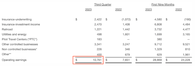 11月4日晚间,“股神”巴菲特旗下伯克希尔·哈撒韦披露2023年三季度财务报告。 财报显示,伯克希尔第三季度实现营收932.1亿美元(约6805亿元),运营利润同比增40.6%,达107亿美元(约781亿元)。 不过,三季度净亏损127.7亿美元(约932亿元),这是今年来公司首度季报亏损。投资出现了241亿美元(约1760亿元)的巨额亏损,主要原因是苹果股价下跌11.7%所致。 此外,公司回购放缓,持有的现金总额达到1572.4亿美元(约11481亿元),创历史新高。 伯克希尔的A类股今年以来已上涨近 14%,与标普500指数涨势相当,在9月19日达到历史最高点后,其股价已从最高点下跌了约6%。 ![]() 运营利润同比增40.6%,得益于保险业绩强劲 巴菲特最看重的盈利指标——运营利润为107.6亿美元,较上年同期的76.5亿美元同比增长40.6%,远超市场预期的89.5亿美元,季环比增长7.1%。 ![]() 其中,三季度保险承销运营利润24.2亿美元,季环比增长94%;保险投资运营利润24.7亿美元,季环比增长4.3%;其他控股业务运营利润33.4亿美元,季环比下滑4.6%。非控股业务运营利润2.26亿美元,季环比下滑58%。 保险业务创造了48.9亿美元的利润,因为Geico汽车保险公司和再保险公司在2022年亏损后赚钱,而利率上升则增加了在美国地区的收入。 虽然伯克希尔的运营利润大幅增长,但该集团确实承认疫情的负面经济影响,以及地缘政治风险和通胀压力。 伯克希尔在财报中表示: 在不同程度上,我们的运营业务受到了政府和私营部门减轻新冠的不利经济影响的行动,以及地缘政治冲突的发展、供应链中断和政府减缓通货膨胀的行动的影响,目前无法合理估计这些事件对长期的经济影响。