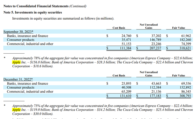 手握现金创历史新高,前五大重仓股不变 随着伯克希尔股价在本季度创下历史新高,回购活动继续放缓。 三季度回购伯克希尔股票时使用了大约11亿美元,二季度曾回购14亿美元或环比减少21%,这令今年前三季度的股票回购总额达到约70亿美元。 截至9月30日,伯克希尔所持的现金、现金等价物和短期美国证券总计为1572.4亿美元,创下历史新高,伯克希尔将大部分现金放在收益率超过5%的美债中。 截至9月30日,大约78%的股权投资公允价值集中在五家公司,五只股票并未发生变化,依然是苹果、美国银行、美国运通、可口可乐、雪佛龙。 ![]() 其中,对美国运通持股市值226亿美元,对苹果持股市值1568亿美元,美国银行283亿美元,可口可乐224亿美元,雪佛龙186亿美元。 此外,还有两家列入投资组合的公司,占被投公司的股份比例偏高,分别是食品公司卡夫亨氏和西方石油。 |