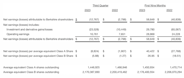 三季度净亏损127.7亿美元,前三季度净利润586.5亿美元 用投资与衍生品损益加上运营利润后得出的归属于伯克希尔股东在三季度净亏损127.7亿美元,而前三季度净利润586.5亿美元;去年三季度亏损27.98亿、去年前三季度为净亏408.4亿美元。 ![]() 伯克希尔再次重申,任何特定季度的投资损益金额通常毫无意义,由此得出的每股净利润数据可能会让对会计规则知之甚少、或一无所知的投资者产生极大误导。 巴菲特倡导看重伯克希尔具体所控业务的运营利润表现,包括保险、铁路、公用事业、能源和零售业等。