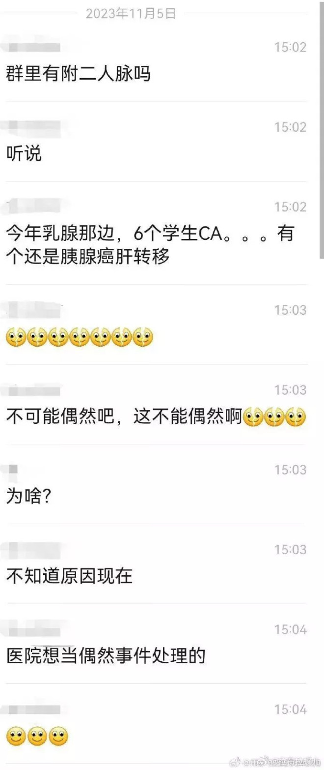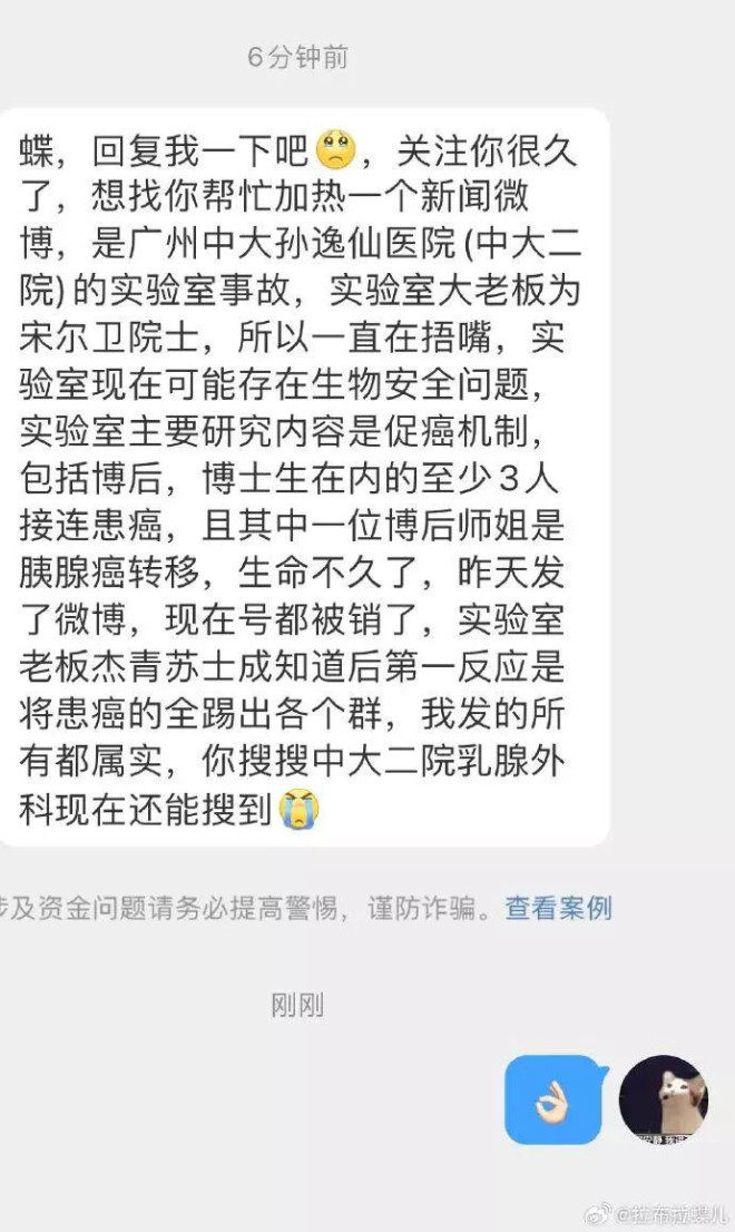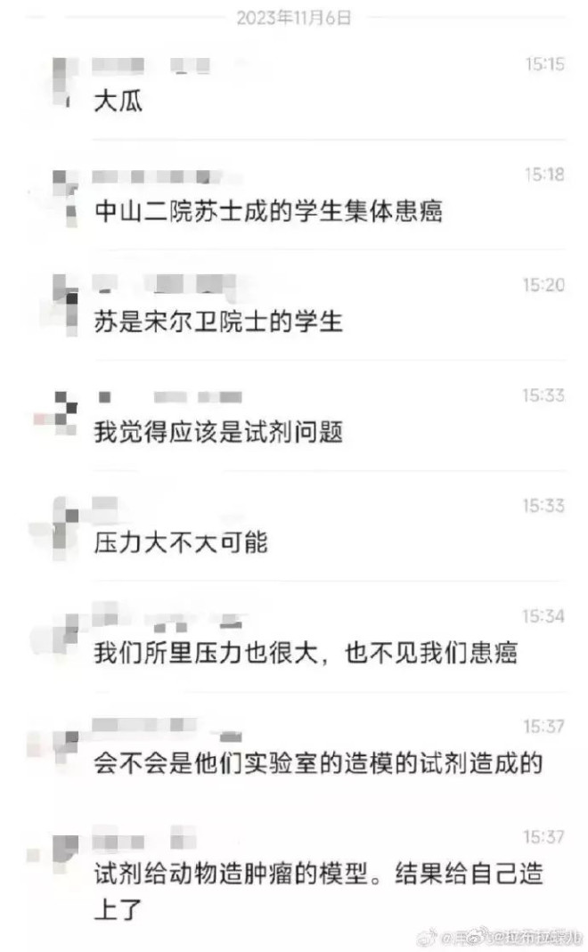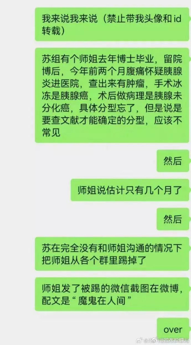 今天有两个很奇怪的热搜“中山二院乳腺外科”和“苏士成”。 本以为是什么新的科学发现,点进去发现,里面的内容简直耸人听闻。 原来,这家医院的医学生,突然集体出现了癌症,而他们都有一个共同的导师,便是热搜中提到的“苏士成”。 在网友投稿中,说疑似原因为实验事故,因为这个实验主要的研究的课题为“促癌机制”。 至少有3位博士生患有癌症,最严重的是一位师姐,胰腺癌转移恐怕命不久矣。 师姐知道自己情况,决定奋力一搏,将自己遇到的情况发在网上,没想到,实验室的老板知道后,没有丝毫的关心,反而将师姐踢出了群。 于是便有了上文的两条热搜,随着事情的发酵,相关的知情人也站出了: 师姐是去年博士毕业的,因为优秀,留下来继续攻读博士后。 只是,今年二月份便生病了,肚子疼,她怀疑是胰腺发炎。 ![]() ![]() ![]() ![]() 没想到,却是最坏的结果,胰腺癌。 胰腺癌本就是是癌症中比较难缠的,但没有最坏,只有更坏。 师姐病理结果为“胰腺未分化癌”。 我简单查了一下,这种病理,差不多占胰腺癌的2%。 ![]() ![]() ![]() 且患有“胰腺未分化癌”一般是老年人,像学姐这个年纪,非常罕见。 苏士成是她的导师,知道事情大致后,他没有任何关心,反手就将学姐踢出了“NAA”群。 看清导师的本质后,学姐后知后觉的在网上寻求帮助。 |