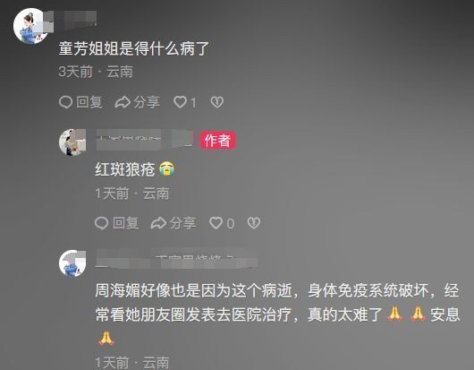 近日,娱乐圈再传出噩耗,一名来自云南的主持人童芳,突然离世,年仅37岁。据知情人透露,童芳也患有红斑狼疮,此次去世就是因为红斑狼疮并发症导致的。 据悉,童芳去世的时间是12月19日凌晨,因为她长期患有红斑狼疮,加上长期熬夜压力大,导致突然发烧,一病不起,在送往医院的路上就不行了。 童芳是傣族人,从小能歌善舞,长得也很漂亮,平时经常参加一些大型会议,当主持人。如今童芳也长期兼任云南夜市的主持人,在当地小有名气。同时童芳还开了一家酒吧,生意很好。但或许是常年连轴转的工作,加上经常熬夜,导致童芳抵抗力下降,旧病复发。 12月18日深夜,童芳还发朋友圈,称自己难受了一整天,晚上用体温计一量才发现一直在发烧,随后又晒出吃药的照片,同时还不忘宣传第二天酒吧照常营业。童芳生着病也不想耽误工作,可见事业心很强,当时的她还不知道这一个小小的低烧会这么致命。 童芳的朋友晒出合照怀念好姐妹,同时也在评论区告诉大家,童芳一直都患有红斑狼疮,平时要很小心注意,尤其流感严重的时候,一点点风吹草动就会让他们大病一场。此次童芳就是因为发烧倒下,随后很仓促地离开人世。 ![]() ![]() ![]() ![]() 最近老牌港星周海媚去世,引起全网轰动,她正是因为红斑狼疮离开的。而童芳也是同样的死因,两人的病情一样,就连长相都是同一种类型。这或许和她们的病症以及长期吃的药有关系,两人的遗憾离去也令大家同样遗憾难过。 ![]() ![]() 周海媚终身未育,去世后很多人遗憾她没有人送最后一程,而和周海媚不同的是,童芳结婚生子了,而且大女儿看起来已经十几岁,且遗传了妈妈的好相貌和舞蹈天赋,还经常去妈妈的酒吧进行表演。 童芳没有晒出过她老公,但这么美丽能干又年轻的老婆离开了,留下可怜的孩子,老公肯定难以接受。童芳的父母也很受打击,得知女儿去世的时候简直万念俱灰。 其实童芳患有免疫系统方面的疾病,就不应该做酒吧这种要长期熬夜的生意。今年8月份,童芳还因为身体不舒服,在家修养了一段时间,可见她发病的频率还是挺高的。 ![]() 但童芳事业心很强,只想拼命努力赚钱,她也确实很优秀很有能力。今年6月份,就曾晒出自己三套房子的房产证,这对一个不算太出名的主持人来说,已经很厉害了。但拥有了三套房和一家酒吧的童芳仍不满足,平时事事亲力亲为,做生意的同时也不耽误主持工作。 其实任何不舒服的时候都需要作息饮食规律,好好修养,尤其是发现任何不舒服的时候一定要及时就医。周海媚去世前自己在家里吸氧,童芳自己随便吃了点退烧药,结果全都耽误了救治。希望她们的悲剧能给大家起到警示作用,也希望她们一路走好,来生有一个健康的身体。 |