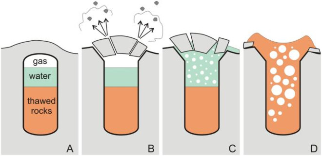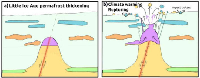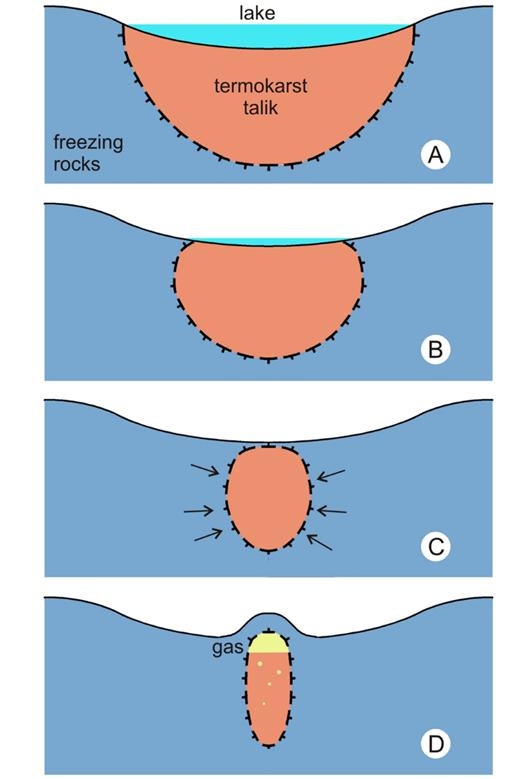 2014年7月中旬,一架直升机正照常飞越俄罗斯西伯利亚西北部的亚马尔半岛。这里居民很少,大部分地面都覆盖着多年冻土。但突然,飞行员在熟悉的绿色地面上,看到了一个突兀的黑色巨洞。随后的实地调查显示,这个洞的洞口直径至少有30米,洞壁几乎是垂直向下,底部被水覆盖,不知道有多深。 前往调查的研究团队试图将摄像机绑在绳子上观察洞底的情况,发现这个洞至少有50米深——因为绳子只有50米长。站在洞口边缘,“你都可以听到地面塌陷的声音和水流的声音,这让我感到一阵恐惧”俄罗斯北极科学研究中心的考古学家安德烈亚斯·普列汉诺夫(Andrei Plekhanov)说道,“它的边缘正在慢慢融化并落入洞中。” 研究团队还发现,洞底空气中的甲烷浓度也异常地高——高达9.6%,而正常情况下空气中的甲烷含量只有不足0.0002%。 我们都知道,多年冻土中贮存了大量的碳,其中不少以甲烷水合物的形式存在。2012年和2013年,这里刚经历过异常炎热的夏季,记录显示,2012和2013年这里比过去的平均气温高出了约5摄氏度。研究人员怀疑,随着气温上升,多年冻土融化并塌陷,并释放出了大量甲烷。然而简单的冻土融化,似乎无法制造出这么大、这么深的洞。 一场爆炸? 自那以后,借助更多的实地探查和卫星图像,研究者发现了至少17个突然出现的巨洞。2017年6月,在亚马尔半岛的一个驯鹿牧民聚居地附近,传来了震耳欲聋的巨响,当地牧民亲眼目睹了不远处剧烈的亮光和升起的烟柱。科学家立刻赶到现场检查,发现了一个新形成的巨洞。这个洞有大约50米深,洞口边的土壤和草像是被烧焦了一样,周围还散落着大块的冰块和岩石。显然,这里发生了一场剧烈的爆炸,“炸”出了这样一个巨洞。 ![]() 卫星图像也展示了一些痕迹,其中显示,2015年一处地面开始变形隆起,而在两年之后,2017年初夏,同样的位置出现了一个巨洞。 ![]() 事实上,在其他有多年冻土分布的区域,也发现过类似的隆起,这种结构被称为多年生冻胀丘(pingo)。这是局部的地下水结冰后体积膨胀,将地表推高形成的。然而在大部分地区,这种结构需要几十年的时间才能形成,而且形成后会随着气温波动自然坍塌,从没发生过这样的爆炸。 而另一个奇特之处在于,目前已经发现的十几个巨洞全都分布在亚马尔半岛和相邻的格达半岛。这里都分布着多年冻土,但不同的是,亚马尔半岛和格达半岛有着丰富的石油和天然气储层——亚马尔半岛上建设了俄罗斯最大的天然气田之一。科学家猜测,这些巨洞或许正与储层中的甲烷等气体有关——是气体的积累让这里发生了爆炸。 积攒“压力” 为了解释这个现象,一个来自俄罗斯的研究团队曾多次前往“新鲜”形成的巨洞处考察。他们发现,这些洞通常都有几十米深,并且洞壁几乎垂直,像是曾有一个圆柱插在其中,然后消失了。从2018年到2021年,他们的猜测逐步成型,并将相关研究发表于《科学报告》(Scientific reports)和《地球科学》(Geosciences)等杂志。 在他们的模型中,这些巨洞的形成与这里的热喀斯特湖有关——虽然叫这个名字,但这些湖和喀斯特地貌并没有什么关系,而是冰层或多年冻土局部融化后,在地表形成的湖泊。 ![]() 由于表面热喀斯特湖的保温效果,湖水下方的地层会比其他区域温度更高,因此会形成一片没有冻结的区域。这片没有冻结的区域就像三明治一样夹在上方的湖泊和下方的冻土之间。 但随着湖泊面积缩小,下方的未冻结区域也随之缩减,冻结往往是由外向内开始的,直到整个未冻结区域被包裹起来。在这个过程中,未冻结区域的压力不断增加,土壤和地下水中的气体逸出,并积累在未冻结区域顶部,此时整个未冻结区域的形状就像是一个圆柱。随着气体压力不断上升,当超过上覆沉积物的极限时,爆炸就发生了——上层的气体和水逸出,只留下了圆柱形的洞壁。 ![]() 爆炸前冻土与热喀斯特湖的变化,图中深蓝色部分代表冻土,橙色部分代表湖泊下方未冻结的地层,黄色部分代表析出的气体。(图片来源:Sergey Buldovicz et al.,2018) 一个形象(但有些恶心)的比喻是,我们可以将这个过程大致比作“挤痘痘”。随着周围皮肤分泌的油脂不断在皮下累积,表层皮肤就会隆起形成“痘痘”,而当痘“长熟”之后,顶部就会爆开,留下一个巨大的毛孔。 ![]() 被削弱的冻土 这个过程会比pingo的隆起与坍塌快得多,似乎也能解释这些巨洞的形态,但还存在一些问题。例如,科学家依然不能确定,这里积累的气体是从哪里来的。这些气体既有可能是甲烷水合物融化释放的,也可能是微生物分解了融化冻土中的有机物后释放的气体。还有一种可能——记得这里的天然气储量吗,有可能是地层深处的甲烷释放到了表层。 而另一个似乎无法解释的问题是,在许多有多年冻土覆盖的地区,都有热喀斯特湖存在。然而只有这两个半岛出现过这样爆炸形成的大洞。 最近,挪威奥斯陆大学的环境地球科学教授海尔加·赫勒旺(Helge Hellevang)提出了新的解释:是地层深部储存的温暖甲烷气体,通过断层渗出、积累,最终通过爆炸逸出。 这种假说将这些巨洞的成因与气候变化联系得更紧密了。15世纪以来,亚马尔半岛和格达半岛夏季的平均气温上升了2~2.5摄氏度,这使多年冻土中较薄的区域被进一步削弱,从而在地层下形成了拱形的脆弱区。 当地层深部的甲烷沿着断层逸出时,这些气体就会自然地聚集在这些拱形区域
