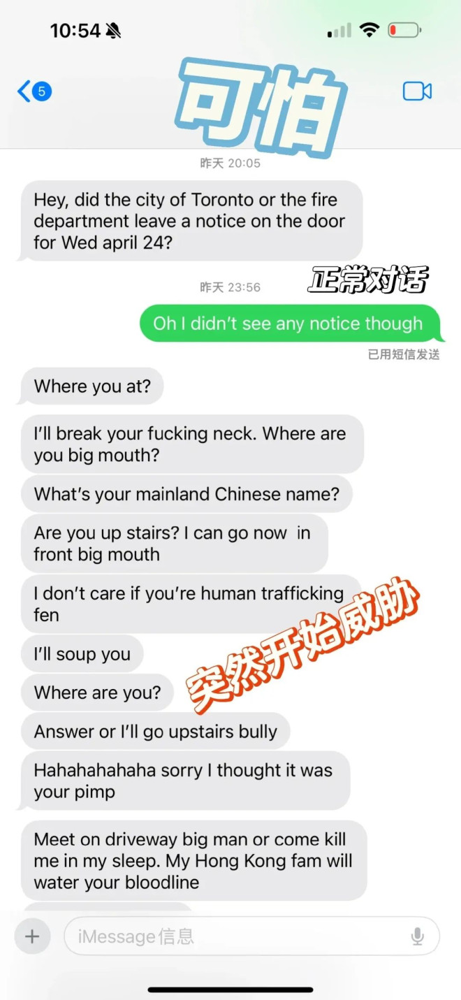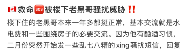 就多伦多现在的市场环境和可负担能力来看,买到或者租到理想的房子都不是一件容易的事。 如果好不容易找到房子,却遇到一个“离谱”甚至可以说可怕的室友,那简直让人心态炸裂! 有一名多伦多华人小姐姐就在自己家里,遭到了同屋的黑人租客性骚扰,最后甚至演变成死亡威胁。 ![]() ![]() 图源:小红书 根据小红书博主小A介绍,自己住house是疫情期间和室友们一起租的。 小A几个人租的楼上,楼下的黑人租客是很早之前就在的,因为房东说是分门出入,而且整个社区环境还挺好的,周边领居华人白人比较多,小A等人也就没太在意。 平时楼下的黑人租客对大家也都很好,基本交流就是水电费和一些围绕房子的必要交流。整理垃圾桶之类的事情也都是分工做,很久都相安无事。 黑人租客最开始是和妻子一起住进来的,当时一切都很好,直到离婚妻子离开后人就变了。 他有酗酒习惯,二月份突然开始发一些乱七八糟的性骚扰短信给小A。回复让他停止之后,他居然恼羞成怒。 小A和房东反应了之后,房东也找他聊了,觉得是醉酒后胡言乱语就先算了。 后来也安稳了一段时间。直到4月末出门前看到他和两个男人在家门前车道上说话,还有很大的酒味。 等到小A快要回家时突然收到机关枪一样的威胁信息。 ![]() 图源:小红书 ![]() 图源:小红书 由于恐惧和担心受到伤害,小A选择了报警。 小A也讲述了报警前要做的准备工作和报警流程,希望大家能够在遇到类似事件时不会手足无措。 首先要保留证据,避免正面冲突。遇到类似事情,其实可以选择立即拨打911。而小A当时刚好和朋友在外面,直接去朋友家住了。第二天打911已经不算紧急情况,要拨打4168082222。 小A最终决定亲自去警局报案。小A和接待警员说了一下情况后就在等待分配警员协助办案。 ![]() 图源:小红书 之后,两位警员带小A去会议室做的笔录把作为证据的短信都截屏airdrop给他们。 警察表示还有给受害者的免费心理疏导服务,如果需要可以随时联系警局。 不过警察也表示像楼下黑人租客这种人都是很喜欢说大话,觉得自己是大哥,其实遇到警察就怕了。真正的大哥都是不张扬的。 最后警察商量了一下,决定逮捕他。 ![]() 图源:小红书 但是,如果他不自己从屋内出来,警察是不能破门逮捕的,交涉之后,他决定自己一小时后去警局。 小A的朋友还在楼上还听到黑人租客很大声和朋友打电话,意思是自己只是给小A发了几个短信,怎么警察就来了。 第二天下午警局打电话来告知我,黑人租客被释放了,但是有禁令,不能靠近小A 500米以内,不能回到小A的家这个地址。 如果我再看到他就可以立刻拨打911,他会去蹲监狱。 但是他有一次机会请警察陪同来拿东西。 但是警察没办法强制他搬走,他还是可以租这个地方,只是人不能出现在这里。 再后续应该是黑人租客将会被告上法庭,虽然报案到现在不到一周时间,但是开庭要排期估计要一年左右。 小A表示,每个族裔都有好人坏人,每个人也都有多面性也会变,希望自己的经历能给大家一点帮助。 当然更希望大家都不要遇到这样的事! |
