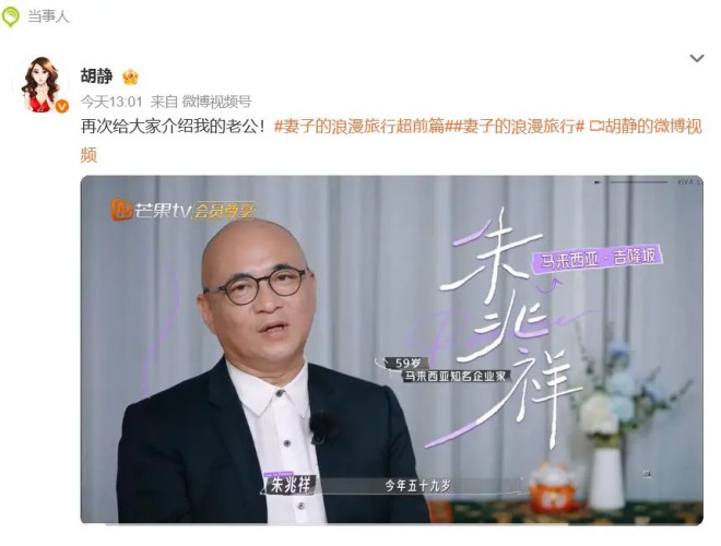 2月20日,知名女星胡静晒出携老公参加综艺《妻子的浪漫旅行》的片段,再次介绍自己的老公,透露对方从事殡葬行业。 ![]() 视频中,朱兆祥自称59岁,是马来西亚知名企业家。 ![]() 46岁的胡静曾主演《人民的名义》《孝庄秘史》《大清后宫》等剧,婚龄17年。 ![]() 朱兆祥自曝从事的是殡葬行业,胡静被问到是否在意这个行业的特殊性时,她表示:“我有一点惊讶,但是我并没有因为他从事这个行业就不考虑跟他在一起。” ![]() 胡静,1978年11月13日出生于云南省楚雄彝族自治州楚雄市,中国内地影视女演员,毕业于中央戏剧学院96级表演系 。1998年,胡静出演了个人首部电影《网络时代的爱情》,由此开启了演艺生涯。2003年,她凭借电视剧《孝庄秘史》中的苏茉尔一角受到了更多关注。代表作有《大明宫词》《少年张三丰》《齐天大圣孙悟空》《康熙秘史》《楚留香传奇》《人民的名义》等。 ![]() 2008年9月,胡静与朱兆祥在吉隆坡办婚礼;2009年11月,胡静生下一子。 |