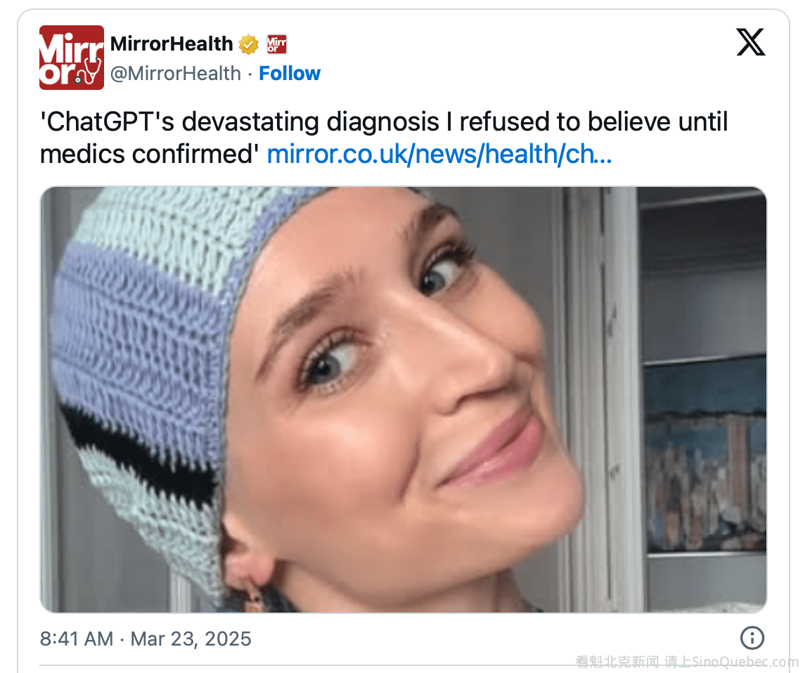 法国女子玛莉(Marly Garnreiter)长期出现夜间盗汗、皮肤搔痒、体重下降等问题,近期更恶化到胸痛、持续疲惫,输入症状之后,被ChatGPT判断罹癌。她起初抱持怀疑态度,未料到医院接受详细检查,竟真的确诊癌症。 2024年1月,玛莉的父亲因为大肠癌去世之后,她开始暴瘦、盗汗、皮肤搔痒,但当时血检结果一切正常,就连医师都认为,可能是悲伤过度影响健康。 随着时间流逝,玛莉逐渐走出丧父之痛,但症状却没有显着好转,“我问了ChatGPT,它说我得了血癌。我没有理它。” 去年圣诞节前后,玛莉明显感觉情况恶化,不仅胸口持续疼痛,而且总是感觉非常疲惫。今年1月,她再度前往医院看诊,扫描结果显示其左肺出现肿块,进一步检查之后,确诊何杰金氏症(Hodgkin's lymphoma),也就是一种淋巴癌。 玛莉坦言,她一开始以为这些都是焦虑症症状,不仅自己怀疑ChatGPT的回复,就连身边朋友们听了也不太相信,所以一直忽略警讯。 玛莉现在已经开始接受化疗,她也向《镜报》表示,“倾听我们的身体真的很重要。有时我们往往会与我们的内在自我失去联系。保持和谐一致是很重要的。” |
