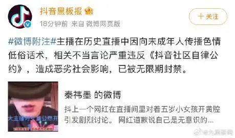 近日,网红克里西在直播间内对5岁女孩开黄腔,引发热议。5月13日,据抖音黑板报 消息:主播在历史直播中因向未成年人传播色情低俗话术,相关不当言论严重违反《抖音社区自律公约》,造成恶劣社会影响,已被无限期封禁。 ![]() |