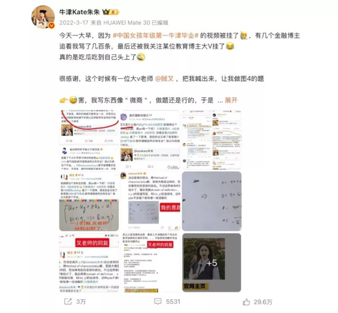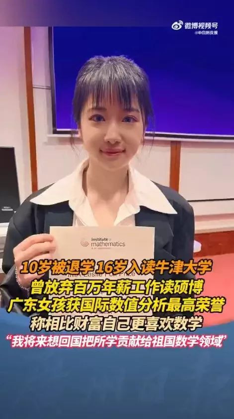 近日,深圳女生朱雯琪在英国数学及应用学会(IMA)两年一届举办的Leslie Fox Prize颁奖中,成为了本届牛津大学唯一得奖者,也是唯一获奖的中国人。朱雯琪表示,希望以后回国进大学工作,把所学贡献给祖国的数学领域。 3年前,朱雯琪发布的一则内容为“牛津大学年级第一毕业”的短片引发关注,并遭到网友的质疑和攻击。然而,在收到一名数学博士大V的出题挑战时,她以绝佳的速度解题,最终“自证清白”。 ![]() 3年前,朱雯琪的“牛津大学年级第一毕业”引发质疑,还收到一名数学博士大V的出题挑战,她却极速解题证清白,反人气暴涨。(微博截图) 因被欺凌10岁退学 却无损其学霸之路 点图放大了解及浏览更多朱雯琪的照片: ![]() ![]() ![]() ![]() ![]() 据了解,今年2月,她收到牛津大学数学系的录取信,11月毕业后留在牛津数学系工作,开始为期两年的博士后研究,明年开设研究生课程,年薪约40万元(人民币,下同)。 不叫妈妈叫老师 朱雯琪祖籍在湖南,在深圳长大。母亲曾经是中科大少年班的毕业生,父亲则是人工智能方向的博士。由于朱雯琪小时候有鼻炎,常常请假影响学业成绩,加之同学常嘲笑她,拿她的鼻炎、外形甚至是姓氏开玩笑。当时只有10岁的她,逐渐变成厌学。 后来,朱雯琪的妈妈决定:自己在家教。而这一教,便是两年。在朱雯琪的记忆里,妈妈更像是导师的角色。有别于学校按部就班的教学方式,母亲会引导她探索,鼓励自己钻研,遇到问题再请教。她每天的学习时间也与同龄人不同。常常是上午10点开始学习,到了中午和妈妈外出吃个午饭,再回来学习到下午5点。 一次偶然的经历,让朱雯琪深深扎下了对数学热爱的根。朱雯琪回忆道,有一次,父亲给她讲起了拉格朗日中值定理、罗尔定理,并演算了怎么证明它们的过程: 但他并没有要我懂的意思,只是玩儿似的跟我演示。 这一通操作却在朱雯琪内心擦出了不小的火花。之后,每一次她见到爸爸都要将步骤回忆并重新演算一遍,问他是不是这样。就这样,她来回演算了30多次,终于把第一次看似“天书”的证明步骤演算完整。自此之后,数学成了她最感兴趣、最著迷的学科。 12岁考上高中 16岁收到牛津录取通知书 在家学习了两年后,朱雯琪高中考进了深圳国际交流学院读书。 16岁那年,朱雯琪迎来人生转捩点——她收到了来自牛津大学的录取通知。2010年,朱雯琪正式入读牛津大学。她表示,在牛津大学读书,能坚持下来的人,都是在做自己热爱的事情,这点最让她受到鼓舞。 所以,很多时候,我很羡慕那些硕士一毕业后,就直接进入读博士从事数学研究的人,他们很清楚一开始要做什么,而不被外界所迷惑。 在谈到自己毕业时的职业选择时,朱雯琪不禁感叹道。 功成名就后 发现数学是自己内心的归宿 2014年,朱雯琪从牛津大学本硕士毕业后,进入了香港的摩根大通资产管理有限公司做投资分析,随后进入香港的高盛投资管理有限公司,前后工作了六七年的时间。投入的高薪工作,让她获得了世俗意义上的“成功”,但也让她陷入了一种“虚无主义”的价值焦虑中。 经过深思熟虑,她决定回到学校再攻读一个数学建模与科学计算的硕士学位。幸运的是,数学的学习之路再次为她带来成功的喜悦:在30多名同修该课程的同学中,她以综合成绩第一毕业,并顺利收到了博士录取通知书。 只要坚持在自己热爱的数学领域持续进步,该来的自然都会来。 |