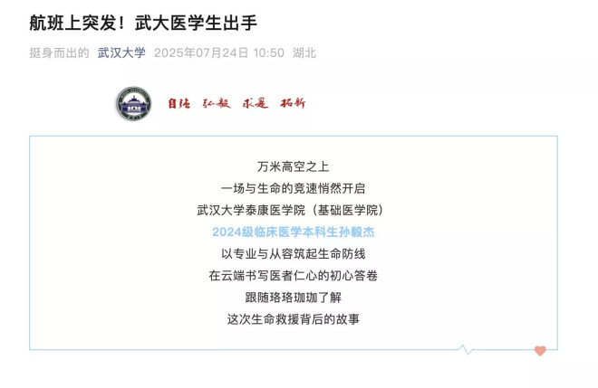 近日,武汉大学发文表扬了一名校内医学生处理了一起航班上突发的急救事件。今年7月19日,一架从武汉飞往新疆的航班,机上一名乘客突发身体不适,2024级临床医学专业本科生孙毅杰和机组人员分工合作,患者转危为安。对于孙毅杰的义举,这篇文章给予了很高的评价,“孙毅杰用行动证明医者的仁心”。 ![]() 文章发布后,大量网友也为孙毅杰点赞,不过也有网友有不同意见,有网友认为,见义勇为是好的,但对于临床知识匮乏,没有执业资格的学生,在飞机上这种抢救手段有限的环境中,患者和施救者都存在很高的风险,武汉大学宣传此事却没有提及背后的风险,欠妥。 ![]() 网络截图。 7月27日,当事同学孙毅杰告诉潇湘晨报记者,那天他在回家的飞机上,听到广播寻医,没有犹豫就过去了。女生精神不太好,说自己头晕手脚发麻,说几个月前在飞机也发作过,情况比较严重飞机还为此备降了。孙毅杰当时手里没有设备,初步给她做了体格检查,脉搏比较细弱,神志也比较涣散,他判断是比较危险的信号。 ![]() 图源/武汉大学。 机组人员在一旁喂女生喝了糖水,喝完后孙毅杰让她躺下,机组人员随后把氧气瓶和急救箱拿来, 孙毅杰给女生吸氧,用急救箱里的仪器 测量了她的生命体征,还好比较平稳。女生躺了一会儿,慢慢好转了,坐起来以后动态复查了生命体征,女生没啥大碍了。 ![]() 图源/武汉大学。 武汉大学发文表扬他后,赢得网友赞誉的同时,也给孙毅杰带来了一些困扰。有网友质疑他才大二,有网友问他有没有行医证,还有网友讨论万一被讹上了怎么办。为此他也在社交平台发文,回应了一些网友的问题。 即使如此,孙毅杰说,他不后悔,也没有后怕。他认为,在飞机上最严重的就是呼吸心跳骤停,这种情况他处理不了也不需要在飞机上紧急处理,在飞机上需要做的就是稳定生命体征,只要掌握操作原则和动态观察就可以。 ![]() 图源/武汉大学。 但是,孙毅杰也建议,和他一样有理想还在学习的医学生们,遇到这种情况,量力而行,尽力而为。出手前要想一想,有没有这个能力,能不能承担后果。孙毅杰说,他所在的学院有临床导师制度,刚入学没多久他就跟了一个临床医学的导师,今年1月一个寒假都待在医院急诊科,开学后也是每周去一次。 他在急诊科见过很多病人,对于危重状况下的抢救比较了解,也会判断病人的生命体征是否在正常范围内,“因为我了解这些知识,所以我有勇气和胆量站出来去做这件事,但是没有这个能力的同学,遇到这种情况还是不要轻易出手,这样会把自己和被帮助者都置于危险的境地。” |