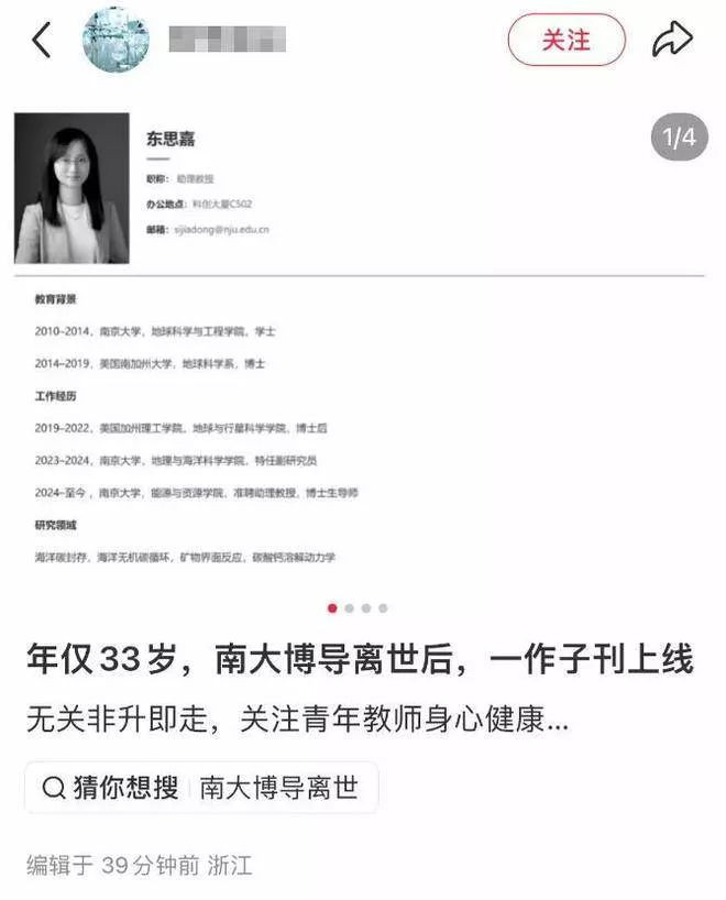 33岁,对很多人来说,人生才刚刚开始——房贷还没还完,娃还没上小学,父母刚退休,而你,正准备在职场“卷”出点名堂。 ![]() 可33 岁的南京大学能源与资源学院准聘助理教授、博士生导师东思嘉博士,竟疑似轻生离世。这一消息宛如一道晴天霹雳,瞬间在学术圈乃至更大范围引发轩然大波。大家震惊、疑惑、惋惜,各种情绪交织。 一位如此年轻有为、前途无量的学者,为何会选择这条决绝之路? 据这位爆料者发文得知,东思嘉助教去世后,其一作子刊上线,在内容的最后,沉痛悼念了东思嘉,证实她确实不在了。 ![]() 文章的最后写道:“在撰写此稿时,我们失去了我们的朋友兼同事东思嘉,发表之际,我们谨将这篇论文献给她,并希望她的精神能够像以前那样激励着其他人。” ![]() 翻看东思嘉的履历,堪称闪闪发光,是无数人眼中 “别人家孩子” 的典范,不得不对她的离去感到惋惜。 2010 年,她凭借优异成绩考入南京大学地球科学与工程学院。大学期间,她的课程绩点全院第一,如同夜空中最亮的星,璀璨夺目。国家奖学金、李四光优秀大学生奖(全国仅 5 人入选,她排名第一)、江苏省三好学生等诸多重量级奖项,纷纷收入囊中。这些荣誉,是她在学术道路上一路披荆斩棘的勋章,见证着她的卓越与不凡 。 本科毕业后,东思嘉前往美国南加州大学地球科学系攻读博士学位。在那里,她一头扎进 “海洋碳封存” 等冷门却前沿的领域。海洋碳封存,这一关乎全球气候变暖能否有效缓解的关键研究方向,犹如一座神秘的宝藏矿山,吸引着无数科研工作者前去探索。东思嘉凭借着自身扎实的学术基础和对科研的满腔热忱,在这片领域开始挖掘属于自己的 “矿石” 。 ![]() 完成博士学业后,她又进入美国加州理工学院地球与行星科学学院进行博士后研究。要知道,加州理工学院可是诺贝尔奖得主扎堆的学术圣地,能在这样的地方开展研究工作,足以证明东思嘉的科研实力已得到国际顶尖学术圈的认可。 在博士后期间,她还积极投身创业领域,与团队共同创办了碳封存技术初创公司,试图将科研成果从实验室推向现实应用,为解决全球碳危机贡献一份力量 。 2023 年,东思嘉毅然决然地选择回国,加盟南京大学。她先是在南京大学地理与海洋科学学院担任特任副研究员,随后迅速晋升,成为南京大学能源与资源学院的准聘助理教授、博士生导师。短短时间内实现如此快速的职业晋升,这在竞争激烈的学术圈中极为罕见,也再次彰显了她的过人之处。 不仅如此,2024 年左右,她还入选了江苏省科协 “青年科技人才托举工程”,并参与国家自然科学基金航次青年首席培训计划,种种迹象表明,她已然成为学术圈备受瞩目的 “明日之星” 。 ![]() 在科研成果方面,东思嘉同样成绩斐然。她先后参与了三次大洋科考航行,那茫茫无际的大海,波涛汹涌,充满未知与挑战,但她毫不畏惧。在科考船上,她与团队成员一起,深入开展深海化学研究。每一次出海,都是一次与大自然的深度对话,也是一次对科研未知领域的勇敢探索 。 在科研实践过程中,东思嘉与团队合作研发出 “深海原位反应装置”。这一装置可不简单,它被写进了教材,成为后续研究者开展相关工作的重要参考工具,就像航海中的灯塔,为后来者指引着方向。在她生前的最后一作论文中,研究聚焦于 “船舶石灰石加速风化(AWL)固碳潜力”。她通过建立模型,成功预测了实验室测量结果,并且在模拟中发现,连续运行 10 年后,海洋表面碱度和溶解无机碳增长 ![]() 在学生们眼中,东思嘉是一位近乎完美的老师。她讲课条理清晰,就像一位经验丰富的导游,带领学生们在知识的海洋中畅游,每一个知识点都被她讲解得透彻明了;科研上,她一丝不苟,对每一个数据、每一个实验步骤都严格把关,追求极致的精准与严谨;而在生活中,她性格开朗,笑起来眼睛弯弯,给人一种如沐春风的感觉。她就像学生们的大姐姐,温暖而亲切,是学生们心目中的 “偶像”,是 “别人家的老师” 。 多位同事用这样的方式怀念她,足以看出她的人缘非常好,同事也都用心了,而东思嘉的精神也将影响着身边人,她会永远活在家人、朋友、同事的心中。 ![]() 南京大学曾这样评价东思嘉,她的故事是南京大学科研精神的延续,也是新时代科研工作者的缩影,在南大苏州校区,她正引领着学生一同探索未知,书写着科研报国的新篇章,用实际行动诠释着“地学鸿雁”的高尚追求与责任担当。 ![]() 可如今,这样一位优秀的学者却突然离去,怎能不让人痛心疾首。关于她离世的原因,其家人没有对外告知,外界众说纷纭。 ![]() 有知情者透露 “疑似轻生,与工作无关”“纯个人原因”,但家人并未公开具体原因。 这也引发了大家的种种猜测,有人认为,或许是长期高强度的科研压力,让她在精神上不堪重负;也有人猜测,可能在个人生活中遭遇了一些不为人知的困境。但无论如何,这些都只是猜测,真相究竟如何,恐怕只有东思嘉自己最清楚 。 |