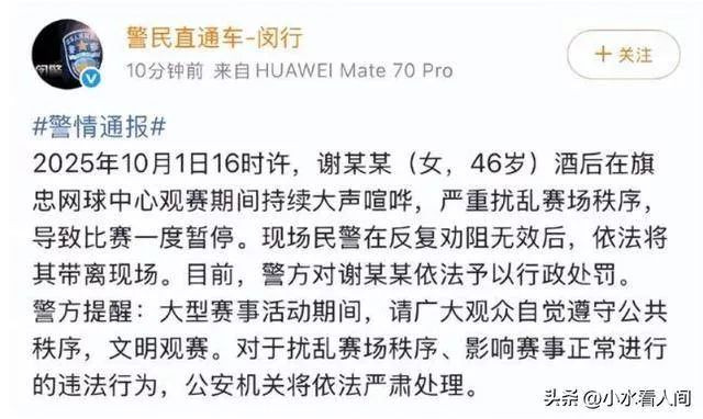 上海“网球姐”大闹赛场的事件,早已超越了一个普通的不文明观赛行为,像一部连续剧,让我们看见文明和教养的缺失。 这件事而其中最让人心疼的,无疑是那个在现场无助的孩子。 ![]() 10月1日,ATP1000上海网球大师赛,这是一次非常重要的赛事。 加上又是国庆期间,所以现场观众几乎座无虚席。 ![]() 在意大利球员贝雷蒂尼对法国球员马纳里诺的比赛中,一位看台上的女球迷多次干扰比赛。 她在看台上前排位置,离比赛场地比较近。 因为这场球赛有她支持的网球偶像,所以为了给偶像助威,她就发疯似的吼叫,手舞足蹈,乱喊一通,严重干扰比赛。 ![]() 安保工作人员劝她安静点,别打扰比赛。 一看被人教育了,女子当场耍横,赶紧从包里拿出一本外籍护照,得意炫耀。 其实她拿出来的是自己儿子的护照,似乎觉得这东西能证明自己尊贵的身份。 ![]() ![]() 炫耀也就罢了,还故意坐到安保人员旁边挑衅,多次用手和肩膀触碰安保人员。 拿着护照的样子,仿佛全世界只有一本一样,趾高气昂的,似乎觉得有了这本护照,她就可以横着走。 母亲大声地吵闹,把她儿子都吓得不轻,孩子都觉得丢脸,捂住耳朵不想听母亲的吼叫。 ![]() 因为比赛被严重干扰,球场的主裁判都暂停了比赛,请她离开现场。 安保人员多了几个人过来,直接劝说女子离场。 女子更加不干了,喊叫得越来越大声,似乎认为别人在欺负她。 ![]() 一看平时就厉害得很,似乎觉得自己高人一等,别人不得动她。 3次以上口头警告无效后,安保人员优先保护她的混血儿子,把孩子并妥善安置。 之后安保人员四五个直接架着胳膊和腿,把她请出场地了。 被抬出去的样子太狼狈了,全场为执法鼓掌,全网都在看笑话。 ![]() ![]() 事后警方通报,46岁谢某因酒后持续尖叫喧哗、多次中断比赛、挑衅安保人员,被依法予以行政处罚。 具体措施未公开,但法律专家分析可能包含 “行政拘留+罚款” 并行。 若被行政拘留,谢某某可能面临 12个月内禁止进入同类体育场馆 的附加处罚。 ![]() 02 随着事件发酵,谢女士的更多信息被网友扒出。 据了解,她来自广东,从事进出口贸易工作,二婚嫁给了一位瑞典籍的跨国企业高管。 谢某于2022年获得瑞典绿卡,并于2024年加入瑞典国籍。 ![]() 她的社交媒体账号被扒,内容非常 “爱炫富” 。 她经常分享吃喝玩乐的内容,例如旅游、西餐、洋酒,参加法拉利活动。 ![]() ![]() 甚至还曾向网友炫耀她的劳力士。 据称,她平时开的是一辆价值将近80万的保时捷豪车。 ![]() 从曝光的照片来看,谢某嫁给瑞典老公后生活过得很好,一家三口出游很温馨。 这么好的生活条件,应该珍惜才对。 可是并不是有钱就代表有素养,这次大闹网球赛,让她迅速陷入了“社会性死亡”的境地。 经过她这么一闹,她同小区的邻居都认出她来了。 ![]() 根据这位邻居透露,谢某之前是做珠宝生意的,这一块确实很挣钱。 谢某是个社牛,跟谁都能快速建立联系,还经常全发消息推荐自己的产品,很多有经商头脑。 平时朋友圈也是和其他社交账号一样,全在晒自己跌奢靡生活。 把自己塑造成一个上流社会成功人士。 而谢某的前男友竟然还是个机长,分手后就嫁给了这个瑞典老公。 可见谢某的社交手腕、经商头脑,颇有过人之处。 ![]() 可以说她的生活已经比很多人超前了,奈何自己不珍惜。 嫁给外国人就以为自己高人一等,心态就飘了。 03 在整个闹剧中最让人心酸的,是谢某的混血儿子。 ![]() 根据多位现场目击者的描述,这个孩子全程都在努力劝阻母亲。 他“紧紧拽着母亲衣角”,小手一次次拉住母亲的手臂,试图制止她的出格行为。 在孩子显然被妈妈失控行为吓到的时刻,母亲却依然沉浸在她的表演中。 可以想象,亲眼目睹母亲如此失态,并在众目睽睽之下被抬离现场,会对这个年幼的孩子造成多大的心理冲击和潜在的心理阴影。 ![]() 母亲本应是孩子的榜样和守护者,却如此失态失格,成了让孩子在公共场所陷入尴尬和恐惧的源头。 在这件事上,谢某最对不起的,可能就是她儿子。 |