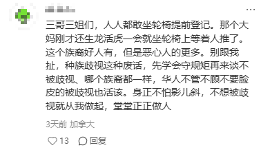 近日,一位华人网友在社交媒体上分享了自己在温哥华飞香港的国泰航班上的经历,没想到掀起了一阵热议。 据网友回忆,当时登机口前队伍井然有序,商务舱、特选经济舱和普通经济舱的乘客都在安静排队等候。 然而,就在大家按惯例等待登机时,一群看似印度裔或南亚裔的乘客突然起身,推着轮椅、带着孩子,不慌不忙地走向登机通道。 ![]() 只要家中有老人或孩童,整个家庭便一同享受优先登机待遇。 队伍中还夹杂着一些年轻人和中年人,他们神情自若地融入优先队伍,丝毫不见迟疑。这些人并非都是真正需要协助的老人或行动不便者,却接连不断地通过优先通道,仿佛手持“特权通行证”。 与此形成鲜明对比的是,排队队伍中不少中国及其他国家的年长旅客,始终安静守序地等待广播通知。 看这眼前的情形,这位网友不禁感慨:“照顾老弱妇孺本无可厚非,但当优先政策被滥用时,初衷就被扭曲了。” 当航班上近三分之一的乘客都声称需要特殊照顾时,“优先登机”这个便民措施就失去了原本的意义。 ![]() 从网友拍摄的照片可见,画面中人数不多,实则因为大部分优先登机者早已提前登机。不少人也留言表示,这种现象在特定航线上屡见不鲜,几乎成为航空旅行中“公开的秘密”。 ![]() “特殊餐”吃得香,普通餐却等到凉 而机上的情况,则展现了另一番景象。 发餐时,机上大多数印度乘客似乎都提前预定了特殊餐食——无论是素食、清真餐还是无乳糖餐,种类繁多。空乘人员忙于逐一派送,态度热情、动作利落,服务显得格外周到。 而普通乘客的饭菜,却迟迟没有动静。 直到飞机飞行近一个小时后,经济舱的餐食才陆续送到其他人手上。那时,前面那片“特殊餐区域”的乘客早已吃饱喝足,甚至有人靠在椅背上小憩,享受着安静时光。 最离谱的是,部分人吃完饭后,直接把餐盘、饮料瓶往过道和应急出口一放,空乘也只是默默弯腰清理,没一句劝阻。 ![]() 这一幕让人难免让人想起之前闹得沸沸扬扬的“国泰毛毯事件”,也是因为服务问题引发的风波。可这次好像走向了另一个极端——不是歧视乘客,而是有些乘客“享福”过头,把整个等级秩序都搅乱了。 现在的做法,让网友也有点看不明白——究竟是航司在经历舆论风波后变得过分谨慎、处处让步?还是其服务标准本就因乘客群体不同而有所区别? 评论区一边倒,全是骂声 评论区无一例外都是在吐槽印度人和航空公司的做法。 网友A表示:“国泰航空包容度极大,唯独不能好好对待中国人。” ![]() 这句话很直接,也道出不少人的心声——大家不是反对多元化,而是担心这种“过度照顾”是不是演变成了对中国乘客的不公平。 网友B吐槽:“就是国泰啊,现在国泰开始引入一大批印度空乘了,我今天就在飞机上看到了,以前从来没见过。” ![]() 这条评论一出,立刻引来很多共鸣,不少人也发现最近国泰航班上印度籍空乘越来越多。 网友C则分享了自己的亲身经历:“之前坐过国泰从香港飞温哥华,简直是噩梦。登机时全是推轮椅的乘客,飞机上几乎都是点特殊餐的。等发普通餐的时候,她都快饿晕了,结果轮到他们时主食已经没了。旁边那个女孩没点特殊餐,但有很多忌口,空乘花了十分钟解释每道菜的原料,最后又给她拿了泡面。” ![]() 从叙述来看,这类情况似乎已非偶发,而国泰也未见有效改进。普通乘客仿佛被默认为“最后用餐组”,权益被一再挤压。 网友D提到了登机时的“轮椅潮”:“印度人,一个个都坐轮椅提前登机。刚刚还活泼乱跳的,一上轮椅就变VIP。别说这是歧视问题,哪国人都一样,真有需要当然该帮,但装的就太过了。” ![]() 网友E爆料:“听说国泰还出过马桶堵塞的事情。” 网友F回复:“马桶堵塞算好的,我空姐朋友说还有直接拉在厕所门口,现在大家都不想排班飞印度的航线。” ![]() 其实,无论来自哪个国家、哪家航司,航空服务的核心都应是维护公平与秩序,而非纵容“会哭的孩子有糖吃”。 当服务资源被少数人通过不当方式挤占,沉默的大多数反而成为了被牺牲的一方。希望航空公司能够真正审视自身的服务逻辑,不要因惧怕批评就陷入“过度补偿”的误区,更不应持续忽视那些遵守规则、安静等待的乘客。 毕竟,真正的尊重,从来不是通过特权来体现,而是让每一个人都在同样的标准下,被平等、公正地对待。 |