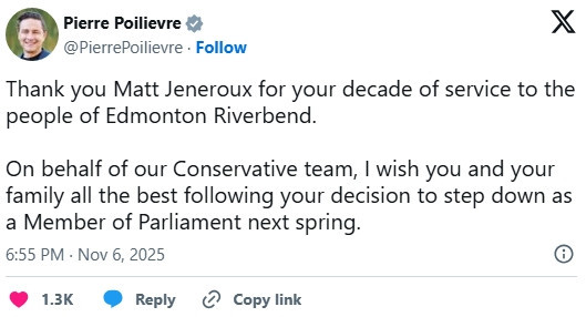 阿尔伯塔省保守党国会议员马特·杰内鲁(Matt Jeneroux)今天宣布辞去国会议员职务,但保守党领袖博励治(Pierre Poilievre)表示,他的辞职要到“明年春季”才会正式生效。 ![]() ![]() 图源:CTV News CTV新闻获得的一封信中,杰内鲁写道:“我参加上次选举时满怀希望,相信加拿大人会信任由博励治领导的保守党团队,给加拿大在国内外带来新的形象。我非常渴望能参与实现这一愿景。” 他并未详细说明辞职原因,仅表示希望未来能“最后一次在下议院发表讲话”,并补充说:“结果与我预想的不同。” 曾传出或“跳槽”自由党在杰内鲁递交辞呈的前一天,渥太华政圈盛传他可能准备“跳槽”到自由党。对此,他的办公室周三向CTV声明:“尽管渥太华流传着各种传言,杰内鲁议员并未考虑转投自由党,仍将留在保守党党团。” 然而,CTV News引述两名消息人士称,杰内鲁在周三上午还与总理马克·卡尼(Mark Carney)办公室的高级幕僚会面。会后,与会各方都认为杰内鲁原本打算“跨党”。 在“跳槽”传闻在国会山迅速发酵后,一名接近杰内鲁的消息人士透露,保守党高层私下警告他若真跳槽“将有后果”。随后,他的办公室迅速发表声明,坚称他不会离开党团。 消息人士告诉CTV,到周四时,自由党方面仍在与杰内鲁保持接触,但他最终决定放弃转党。据称,他的主要顾虑是“能否信任自由党”。 同一天,杰内鲁没有出席对自由党政府预算案的首场信任投票,该投票最终由自由党顺利通过。 保守党两天内再失一人杰内鲁成为两天内第二位离开保守党阵营的议员。就在周二,新斯科舍省议员克里斯·德安特蒙(Chris d’Entremont)已宣布正式转投自由党。 德安特蒙当时解释说:“我觉得自己已无法认同反对党领袖所强调的理念。” 德安特蒙的“跳槽”消息震惊国会山,党内多名议员认为此举动摇了博励治的领导威信。 博励治办公室陷入“防叛”风暴过去48小时,博励治办公室焦头烂额地排查党内是否还有其他潜在“倒戈”议员,试图摸清是否会有更多人步德安特蒙后尘。 杰内鲁周三缺席了保守党每周党团会议与下议院会议,引发外界更大揣测。当天下午,他的办公室紧急发布匿名声明否认出走。 而德安特蒙在加入自由党后公开表示,“我相信还有其他人和我一样,感到与党领导层脱节。” 党内议员私下也承认,德安特蒙的离去“出乎意料”,令外界重新质疑博励治的领导风格与党内凝聚力。 自四月大选失利以来,博励治试图通过增加党内成员曝光机会、接受媒体访问等方式重建形象, 就在杰内鲁宣布辞职当天,新民主党与自由党议员联手,否决了保守党针对政府预算的修正案。 保守党原希望通过投票,让所有党员都公开表态反对预算,以此让潜在“叛变”议员更难再投靠政府阵营。 德安特蒙的“跳槽”引发强烈反弹。安省议员贾米尔·吉瓦尼(Jamil Jivani)在社交媒体上怒斥他是“白痴(an idiot)”,卑诗省议员亚伦·冈恩(Aaron Gunn)更称他是“懦夫(a coward)”。 相比之下,党内对杰内鲁的辞职反应平和得多。 议员加内特·吉纽斯(Garnett Genuis)写道:“能与马特共事是我的荣幸,他一直是选民坚定而有力的代言人。” 保守党党鞭克里斯·瓦肯廷(Chris Warkentin)也发声明赞扬好友:“在担任国会议员10年、阿省省议员4年后,马特为社区与国家留下了卓越的服务遗产。” ![]() 图源:Twitter 杰内鲁自2015年起代表阿尔伯塔省埃德蒙顿河湾选区(Edmonton Riverbend),在保守党内长期关注家庭政策、心理健康与中产阶层议题。 博励治在声明中感谢他“十年来的奉献”,并祝福他与家人一切顺利。“我们祝他在明年春天正式离任后,开启人生新篇章。” |
