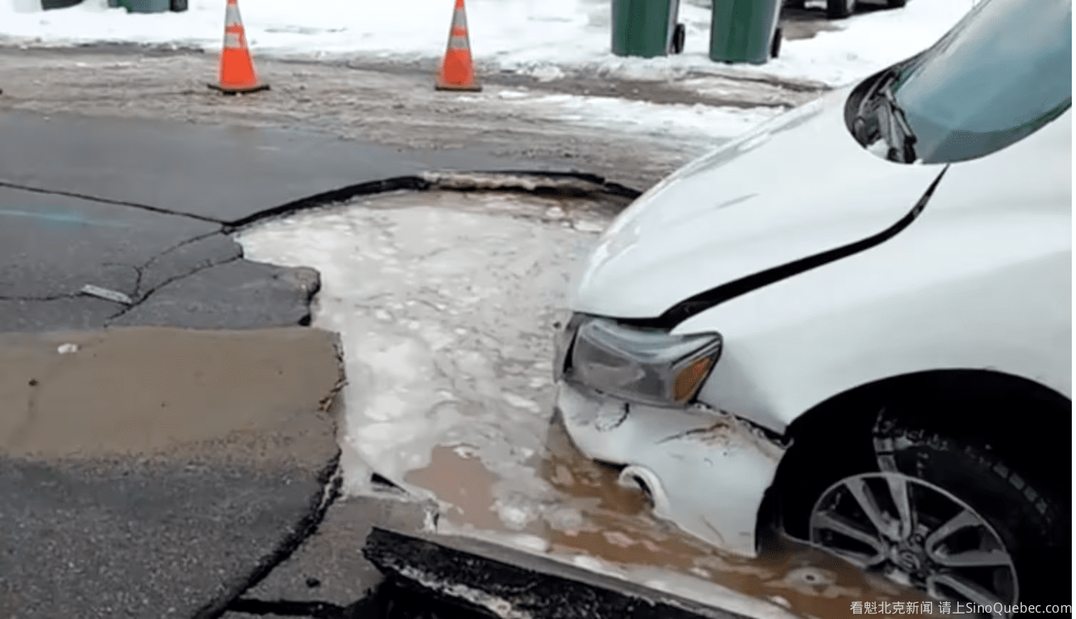 周二上午,一辆SUV在魁北克省Saguenay市Jonquière区的Sainte-Berthe街行驶时遇到意外,路面沥青在车辆下方塌陷,车辆前轮陷入一个巨大的坑洞。 据称该坑洞是由于供水管道泄漏导致的。 司机没有受伤,但车辆受到损坏,需要使用拖车将其从坑中拖出。 Saguenay市公共工程部门迅速到场,设置安全措施,防止再次发生事故,该路段已暂时封闭,预计将在道路修复完成后重新开放。 |