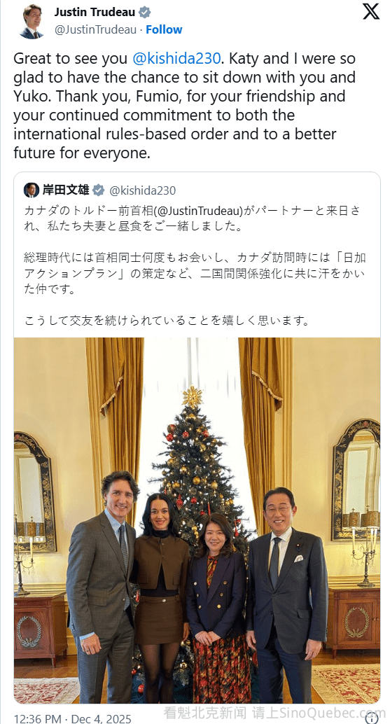 Katy Perry在社交媒体上正式公开了她与加拿大前总理特鲁多正在萌芽的恋情——距离他们首次被传出恋爱绯闻已有四个月。她向粉丝分享了两人最近的日本之旅。 在 12 月 6 日的 Instagram 帖文中,41 岁的 Katy 分享了她访问日本的多张照片和影片,她三天前刚在当地举办了 Lifetimes Tour 演出。 照片轮播中包括一张甜蜜自拍,她与特鲁多在秋意盎然的林木背景下露出灿烂笑容。 Katy 还发布了一段黑白的短片,拍摄于她与特鲁多的晚餐约会,两人并肩坐着,Katy品尝当地料理。她在贴文写道:“东京巡演时光,还有更多精彩。” 旅途中,Katy 与特鲁多也会见了日本前首相岸田文雄及其夫人岸田裕子,并在一棵圣诞树前合影。 “我和 Katy 很高兴有机会与你和裕子女士见面。” 特鲁多在 12 月 4 日于 X上回应岸田文雄时写道。“谢谢你,Fumio,感谢你的友谊,以及你对国际规则秩序与更美好未来的持续承诺。” 在 Katy 今年与前未婚夫 Orlando Bloom 分手后,她与特鲁多—— 后者已于 2023 年与妻子 Sophie Grégoire Trudeau 分居 —— 于 7 月在蒙特利尔一起共进晚餐后,便引发了约会传闻。自那之后,两人多次一同公开现身,包括 10 月在巴黎庆祝这位歌手生日时,一起前往当地一家歌舞表演场所的约会。 不久之后,Katy 在社交媒体上低调地出现了 特鲁多的身影。她在 Instagram 上发布了一段影片,内容是她在演唱会后台收到生日蛋糕。眼尖的粉丝注意到,在影片中她吹灭蜡烛时,特鲁多正在背景里微笑并鼓掌。