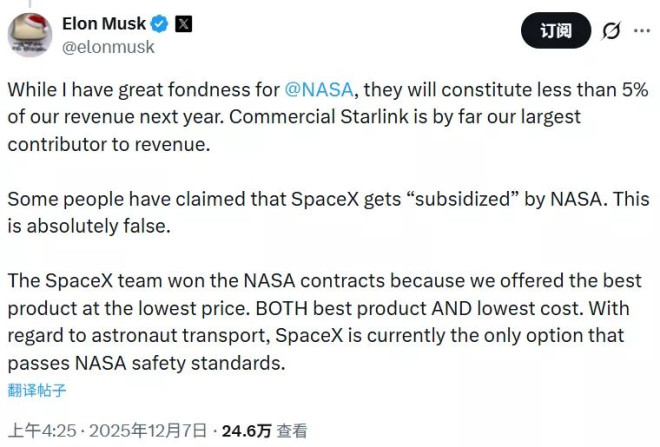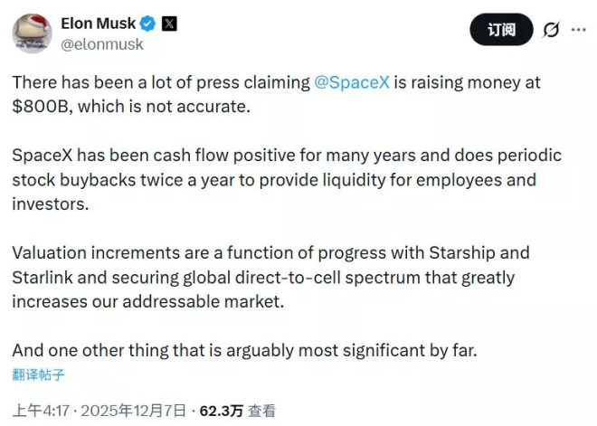 针对商业航天龙头SpaceX“冲击8000亿美元估值,并瞄准明年IPO”的最新传闻,世界首富马斯克在北京时间周日凌晨公开回应。 他在社交媒体上发帖称,SpaceX以8000亿美元估值融资的消息“并不准确”(not accurate)。 他也接着表示,SpaceX已经是一家多年现金流为正的公司,每年会进行两次股票回购,为员工和投资者提供流动性。估值的提升取决于星舰(Starship)和星链(Starlink)的推进进展,以及获得全球直连手机网络的频谱,这将大幅扩大公司可服务市场的规模。 ![]() 马斯克进一步表示,相比于8000亿估值,还有一件事更加重要。 他写道:“我个人非常敬重NASA,但明年他们在我们总收入中的占比不会超过5%。商业化的Starlink(星链)仍然是我们收入贡献最大的一块。外界有些说法认为SpaceX是靠NASA“补贴”起来的,这种说法是完全错误的。“ 马斯克强调:“SpaceX能拿下NASA的合同,是因为我们既能提供性能最好的产品,又能做到最低的成本——两者同时做到。在宇航员运输业务上,SpaceX目前是唯一通过NASA安全标准的方案。” ![]() 截至发稿,马斯克并未对SpaceX“瞄准明年IPO”一事予以回应。 |