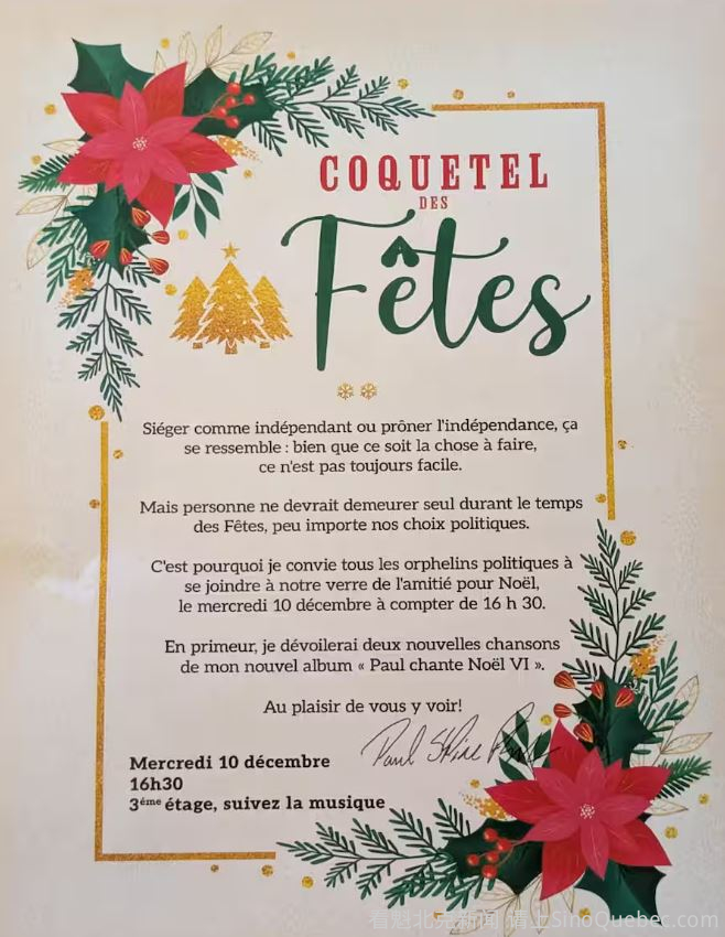 魁北克党党魁 Paul St-Pierre Plamondon 邀请所有在国民议会中无党籍的议员,与他及魁人党议员一起参加一场将独立主义者与独立议员聚在一起的圣诞派对。 他向目前以独立身份坐席的八名议员发送了一份小小的邀请函,邀请他们参加 12月10日(周三)16时30分 在国民议会举行的「节日鸡尾酒会」。 Paul St-Pierre Plamondon 在邀请中写道:作为独立议员或主张独立,其实很相似:虽然这是应该做的事,但并不总是轻松的。不过无论政治选择如何,没人应该在节日期间独自一人。 他因此邀请所有「政治孤儿」加入魁人党的六位议员,共饮一杯象征友谊的酒。 Paul St-Pierre Plamondon 甚至承诺现场独家公开他新专辑 Paul chante Noël VI 中的两首新歌。 目前国民议会的八名无党籍议员:
