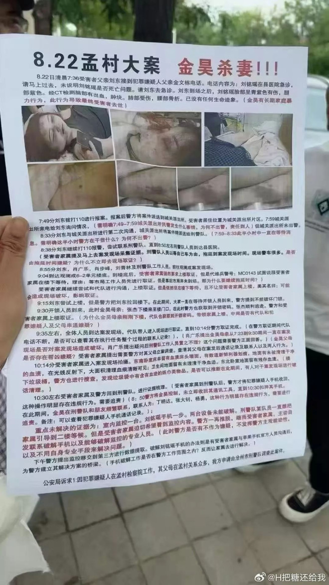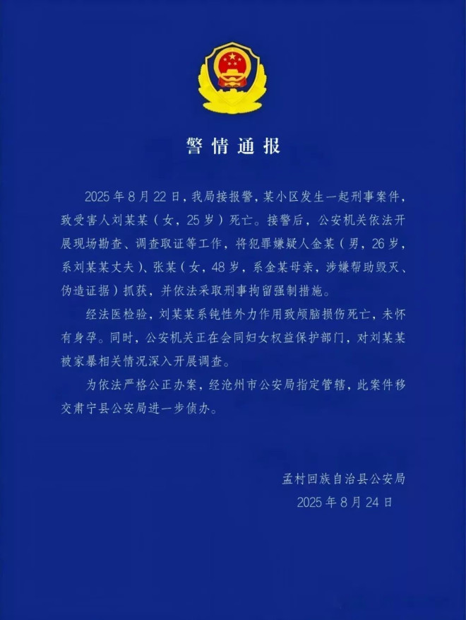 记者从沧州市中级人民法院获悉,2025年12月9日,沧州市中级人民法院一审公开宣判,判处被告人金昊死刑,剥夺政治权利终身;判处被告人张杰(金昊母亲,帮助毁灭证据罪)有期徒刑2年2个月。 此前报道 8月22日,一则关于河北沧州孟村县女子刘某某疑遭丈夫金某家暴致死的消息在当地流传,并迅速引发关注。 8月24日23时27分,当地公安局发布警情通报称,已将犯罪嫌疑人金某、张某抓获。 通报指出,2025年8月22日,孟村县公安局接报警,某小区发生一起刑事案件,致受害者刘某某(女,25岁)死亡。接警后,公安机关依法开展现场勘查、调查取证等工作,将犯罪嫌疑人金某(男,26岁,系刘某某丈夫)、张某(女,48岁,系金某母亲,涉嫌帮助毁灭、伪造证据)抓获,并依法采取刑事拘留强制措施。 ![]() 刘某某被送院画面。(微博@_HHuANG_1) ![]() 河北沧州孟村县25岁女子刘某某遭丈夫家暴身亡。(微博@_HHuANG_1) ![]() 刘某某一家三口。(网上图片) ![]() 警方通报。(孟村回族自治县公安局) 通报进一步披露,经法医检验,刘某某系钝性外力作用致颅脑损伤死亡,未怀有身孕。为依法严格公正办案,经沧州市公安局指定管辖,此案件移交肃宁县公安局进一步侦办。 网传这是一起家暴致死案,刘某某长期遭遇家暴,直至悲剧发生。对此,8月25日,孟村县妇联工作人员告诉中国新闻周刊,此前没有接到过当事人反馈家暴情况,当前已和县公安局取得联系,下一步将与受害者家属见面沟通相关事宜,根据其需求提供法律援助。 受害者家属不认同“家暴”这一说法。受害者刘某某的弟弟刘刚(化名)告诉中国新闻周刊,这不是简单的家暴,案发当晚监控画面显示,金某的父母曾出现在现场,“是他们一家害死了我姐姐”。 来源:央视新闻、中国新闻周刊 ![]() 刘某某生前照片。(微博@是金子总会发光Zz) ![]() 刘某某生前照片。(微博@是金子总会发光Zz) |