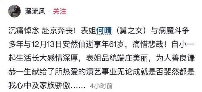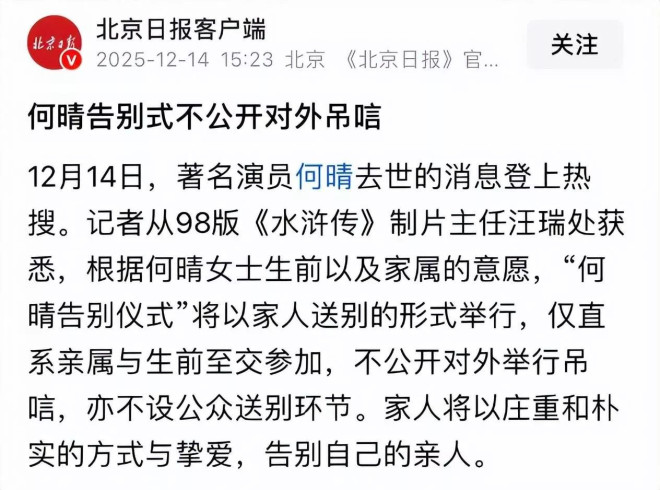 12月14日,演员何晴去世的消息引发全网悲痛,作为家喻户晓的知名女演员,何晴的离去是整个演艺圈的损失,才61岁就突然离去,任谁不觉得惋惜呢? ![]() 关于何晴去世的原因,据媒体报道得知,何晴十年前被确诊脑癌,虽然后续做了手术,但还是没能控制住病情的恶化,好友马德华也告知,何晴的身体一直不好,只是没想到会病得如此严重。 ![]() 在何晴去世的消息公开后,同班同学王明强接受了媒体采访,他公开了何晴手术后的照片,如果不说照片里的人是何晴,真就难以认出,瘦了太多。 ![]() 照片中,何晴坐在病床前,她剪了短发,人仿佛一下子老了很多,精气神都没了,连坐立的力气都没有,只能扶着东西支撑着身体,看她憔悴的模样,可想她病得有多严重。 ![]() 想来此时的何晴刚刚度过难关,人正是虚弱、脆弱的时候,同学的到来也给了她很多信心,她靠在同学肩膀上,嘴角微微上扬着。 ![]() 据王明强透露,何晴一直以来都是乐观、坚强的面对一切,她希望像李雪健一样,能够战胜病魔回到舞台上。 在人生的最后阶段,何晴托王明强为其办最后一件事,希望能够找到自己的档案,好办理退休,可惜王明强一直没有办理好,为此成了遗憾。 ![]() 何晴的邻居张山透露,何晴不光是脑癌,她还中风过,他曾在院子里见过阿姨推着何晴。 ![]() 据了解,何晴的父母多年前都去世了,何晴的儿子跟着前夫许亚军生活,在生命的最后阶段,只有阿姨陪在何晴身边,也是蛮孤单的。 ![]() 回顾何晴这一生,是精彩的、体面的、也是波折的,她的事业很成功,是唯一一位出演过四大名著的女演员,虽然没有到达一线女演员的行列,但论知名度,她的名气很高,被公认为“古典美女”,也是很多网友心中的“梦中女神”。 ![]() 但戏外的现实生活,何晴没有遇到能陪她走到最后的人,和刘威轰轰烈烈爱了五年,却没办法携手步入婚姻,两人最终遗憾分手。 ![]() 何晴后来因戏与许亚军结缘,那时她和许亚军可谓是男才女貌,两人也都处于事业最火的阶段,许亚军与第二任妻子离婚后,选择与何晴组建家庭,婚后生下儿子许何,孩子的名字是以两人的姓起的。 ![]() 谁也没想到,儿子才2岁多,两人就因性格问题选择离婚,何晴把儿子的抚养权给了许亚军,她说和许亚军的关系已经从夫妻变成了朋友,给予了彼此体面与尊重。 ![]() 后来何晴的曝光度越来越少,最后一次公开露面还要追溯到2023年,当时何晴与好友傅艺伟相聚,比住院的时候稍微胖了一些,依旧是那么漂亮、优雅。 ![]() 2022年,何晴与好友廖京生相聚,很多人都误以为两人是夫妻,其实只是好友,廖京生曾公开否认过。 ![]() 关于何晴的告别仪式,媒体从《水浒传》制片主任汪瑞处获悉,何晴的告别仪式将以家人送别的形式举行,仅直系亲属和生前至交参加,不公开对外据悉吊唁,不设公众送别环节。 ![]() 当下,何晴的家人已从浙江赴京奔丧,弟弟也公开发文悼念,称表姐何晴是全家的骄傲,一生善良、端庄美丽。 ![]() 愿何晴一路走好,她留下的经典作品,将永远铭记在大家心中 |