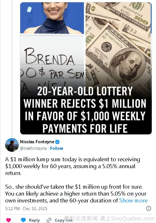 赢得 Loto-Québec 的头奖无疑是梦想成真,但同时也要面对一个重大抉择:一次性领取奖金,还是选择长期分期领取? 这个决定可能成就,也可能毁掉一个人的财务未来,而且几乎没有标准答案。理财顾问往往各执一词,但归根结底,选择取决于你的年龄、理财能力以及长期目标。 最近,一位 蒙特利尔女子的大胆决定在网上引发了激烈争论。人们对于她究竟是做出了明智选择,还是犯下代价高昂的错误,看法严重分歧。今年 7 月,Brenda Aubin-Vega 在工作休息时间刮开一张即开型彩票,发现自己中了 Loto-Québec 的 Gagnant à vie 最高奖。 Aubin-Vega 当时有两个选择:一次性领取 100 万元,或是终身每周领取 1000 元。 年纪还不到 30 岁的她,最终选择了每周领取。几个月后,这个故事再次在网上被翻出,引发了新一轮热议,人们激烈争论她是否选对了。 过去几天里,X 等社交平台上的网友纷纷开始“算账”。有人认为,她放弃了相当可观的一笔钱。 “她在做出这个极其不幸的决定前,应该先咨询理财顾问,”一名网友写道。 另一位网友详细计算称:“按 3% 的利率计算,需要 28.6 年的每周领取才能等同于 100 万元;4% 是 36.6 年;5% 的话则要 64.1 年。”他还补充说,如果把 100 万元拿去投资,年回报率略高于 5%,仅靠分红就足以每周产生 1000 元收入,甚至不用动本金。 投资潜力被反复提及。一位网友计算,如果选择一次性领取,并投资于年均回报 10% 的高收益 ETF,20 年后这笔钱可增长到约 673 万元——而这正是 Aubin-Vega 通过每周领取,20 年才能拿到的总额。 “这正说明加拿大的金融教育有多重要,”另一名评论者写道。 不过,也有不少人力挺她的选择。 “如果她身体健康,这是个明智决定,”一名支持者表示。“平均剩余寿命 64 年:每周 1000 元,一年 5.2 万元,64 年就是 332.8 万元,名义价值是一次性 100 万元的 3 倍以上。” 还有人指出,长期领取在现实层面也有优势:“至少可以避免亲戚朋友想方设法向她要钱。” “她还年轻,一生还很长,每月 4000 元再加上自己的收入,能减轻很多经济压力,”另一位网友写道,“祝她一生幸福、长寿。” 有分析指出,大约 19 年后,她累计领取的金额就会超过 100 万元,此后得到的就都是长期净收益。 根据 Loto-Québec 的新闻稿,Aubin-Vega 是在 蒙特利尔一家便利店、工作休息时间买了两张 Gagnant à vie 彩票。她在工作地点外刮开后,看到三个小猪存钱罐的标志,意识到自己中了大奖。 她第一时间打电话告诉了父亲,随后请假回家,消化这份惊喜。 她告诉 Loto-Québec,计划用这笔钱买房。 理财顾问通常建议年轻中奖者选择一次性领取,以最大化长期投资回报。理由很简单:年轻人拥有数十年的时间,可以通过合理投资让资金大幅增长。 但稳定、终身的保障收入同样有其价值——它不会因投资失误、市场崩盘或糟糕的财务决策而消失。Aubin-Vega 已锁定终身每年 5.2 万元的收入,不论经济环境如何变化。 她是否做出了正确选择,也许不完全取决于数学计算,而在于她最看重哪种财务安全感。考虑到许多彩票中奖者最终挥霍一空,一份终身稳定的“工资”,未必是最差的安全网。
