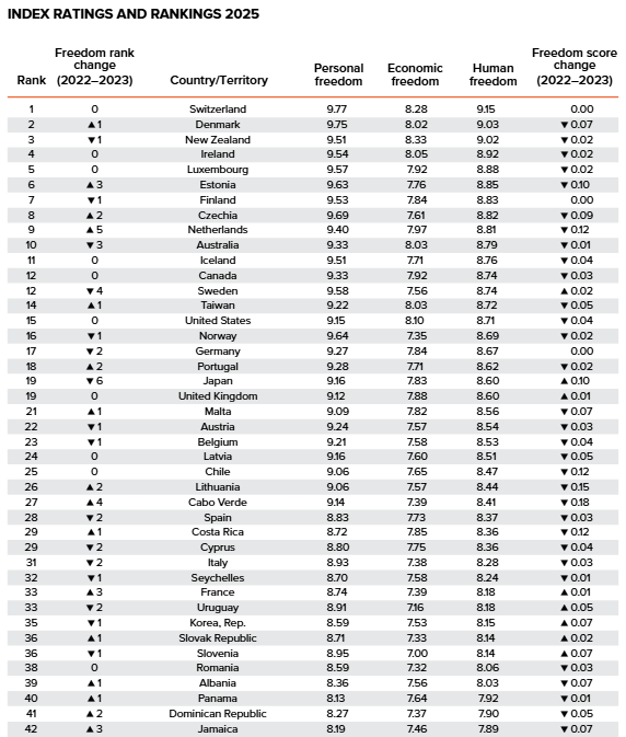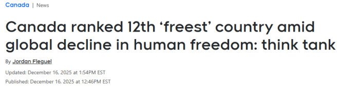 一家加拿大偏保守立场的智库根据一项全球指数,将加拿大评为全球第12个“最自由”的国家。不过,该机构同时指出,近年来全球绝大多数人口的自由程度都在下降。 ![]() ![]() 图源:Postmedia 加拿大菲沙研究所(Fraser Institute)与美国的卡托研究所(Cato Institute)周二联合发布了年度《人类自由指数》报告。报告发现,到2023年(目前能取得的最新数据)为止,全球近90%的人,比2019年时拥有的自由更少。 菲沙研究所高级研究员、该报告的共同作者马修·D·米切尔(Matthew D. Mitchell)在新闻稿中表示:“近年来,世界各国政府在限制言论自由、结社和集会自由、行动自由,以及使用稳定货币的自由。” 他直言,这种趋势“令人担忧”。 研究所介绍,这项指数通过87项指标来衡量个人在生活选择和经济决策方面的自由程度,评估范围包括法治、安全保障,以及言论、集会和宗教自由等多个方面。 在参与排名的165个国家和地区中,加拿大根据2023年的数据排名第12位,与前一年持平。不过,加拿大的总体自由评分下滑了0.03分。 美国同样保持在第15位,但其自由评分比2022年的数据下降了0.04分。 报告显示,瑞士连续多年被评为全球最自由的国家,今年依然位居榜首,自由评分与去年持平。 与此同时,丹麦超过新西兰,升至第二位;爱尔兰和卢森堡分别保持在第四和第五位。研究所指出,这四个国家的自由评分都比上一年有所下降。 在榜单另一端,叙利亚被评为全球最不自由的国家,其后依次是伊朗、也门、苏丹和缅甸。其中,伊朗和苏丹在2023年的自由排名相比前一年有所上升,而其他三个国家的评分则继续下滑。 研究所表示,这一轮自由倒退的趋势几乎遍及全球各个角落,不论是富国还是穷国、民主国家还是非民主国家,都受到了影响。 菲沙研究所强调,持续关注各地的自由状况非常重要,因为生活在更自由国家的人,通常整体生活质量更高,收入更好,也更健康、更幸福。 米切尔在报告中表示:“很多人认为,自由本身就有价值;但除此之外,自由也确实让生活变得更好。” 全球自由度排名前20的国家和地区如下: