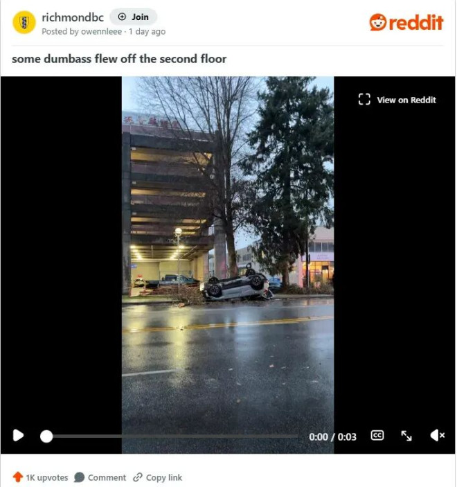 如果你昨天路过列治文总统广场一带,却发现警车、消防车、救护车扎堆,路被封得明明白白,那你并没有错过什么——是列治文又一次,用一种让人沉默的方式,刷新了大家对“驾驶水平”的认知。 ![]() 事情发生在周一下午三点多,一辆车从统一广场二楼停车场的边缘直接冲了出去,没有犹豫、没有转弯,像是对地心引力有着坚定的信仰,当场完成了一次“汽车跳楼”。车子翻了个底朝天,四个轮子朝上,重重砸在下面的坎比路上,顺便把停车场的金属围栏也一起带走了。 ![]() ![]() ![]() 现场照片和视频很快在社交平台上传开。画面里,那辆中型车躺在路中间,车顶压扁,周围是被撞歪的护栏、散落的碎片,以及一群站在远处、表情复杂的围观群众。更让人后怕的是,事故发生时,下面那条路上没有行人、也没有车辆经过——这种程度的“刚好没人”,让人一时间分不清是幸运,还是命大。 ![]() ![]() ![]() 车里的一男一女被困在车内,消防员赶到后才把人救出来。急救部门出动的阵仗不小,初级护理、高级护理、主管级医护人员齐上阵,几辆救护车轮番上场。两名伤者被紧急送医,一度被形容为情况危急,后来警方又补充说没有生命危险。无论如何,这一摔,足够让人记一辈子。 ![]() ![]() ![]() 至于事故到底怎么发生的,目前官方说法仍然是“正在调查”。但这并不妨碍网友们迅速进入“列治文驾驶分析大会”模式。有人猜是倒车时踩猛了,有人坚持是把油门当刹车,还有人一本正经地表示:不管是哪种,在列治文都说得通。 很快,评论区彻底歪楼。 “这甚至在列治文都显得太列治文了。” ![]() “当我以为列治文已经无法再更列治文时,它又努力了一把。” ![]() “《速度与激情:梦回列治文》什么时候上映?” 还有不少本地华人表示,这事虽然吓人,但心理上居然没有那么意外。有人直言,那个停车场、那个位置,自己路过时就常常心里发毛,总觉得哪天会出事,结果真的出了。也有人调侃说,现在在列治文已经不仅不敢靠窗吃饭,连走路都得时不时抬头看看天,生怕哪辆车突然从空中加入交通系统。 ![]() 更扎心的是,这起事故并不是孤例。长期以来,“列治文司机”早已成为一种网络标签,从倒车进店、油门当刹车,到冲进商场、撞进餐厅,几乎每隔一段时间就要在新闻里露一次脸。久而久之,大家甚至形成了一种奇怪的免疫力:震惊是有的,但更多是一种“果然如此”的无奈。 ![]() ![]() 当然,玩笑归玩笑,这次事故的危险程度一点都不低。如果当时正好有人走在人行道上,后果恐怕不堪设想。也有网友提醒,正值圣诞假期,不少人刚长途旅行回来,时差、疲劳、精神不集中叠加在一起,本就不适合开车,更别说在结构复杂的停车场里操作车辆。 ![]() ![]() 列治文皇家骑警和消防部门随后封锁了相关路段,直到傍晚才恢复通行。路面清理干净了,护栏之后也会重新修好,但关于“开车这件事到底能不能再认真一点”的老问题,恐怕不会那么快有答案。 ![]() ![]() 或许对列治文居民来说,真正的安全提醒已经不再写在路牌上,而是刻在经验里:经过停车场出口时多留意,上街时别只低头看手机,遇到奇怪操作先保持距离。毕竟,在这里,永远不知道下一辆车,会从哪个角度刷新你的认知。 这一次,幸好没有无辜路人受伤。下一次呢?谁也不敢保证。 |