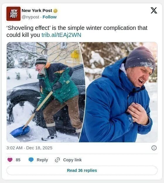 天气预测大温的圣诞节清晨,一些高地可能会飘雪花,看来又开始准备雪铲了~ 随着冬季降雪频繁,虽然洁白的雪景令人喜爱,但铲雪活动可能暗藏健康风险。 美国心脏协会(AHA)警告,铲雪尤其是大雪时,可能增加心脏病发作或猝死的风险。 研究显示,铲雪虽是一种体力活动,对心脏有一定锻炼作用,但如果平时缺乏运动,突然进行大强度体力劳动,反而可能适得其反。 ![]() 奥克兰大学William Beaumont医学院内科教授Barry Franklin指出:“重度铲雪对心脏的负荷甚至可能超过跑步机压力测试”。 研究发现,仅两分钟铲雪后,参与者的心率就超过了最大心率的85%,体能最差者的心率升得最高。铲雪消耗的能量与网球或慢跑相当。 ![]() 为什么铲雪会危险? 加拿大医学会杂志的一项研究显示,男性在铲7到8英寸(约18-20厘米)积雪后,心脏病发作及死亡风险明显高于女性。 除了体力消耗,低温也会收缩血管、升高血压;再加上举铲雪时屏气,会进一步增加心率和血压,从而提高心脏事件风险。 ![]() 哪些人风险更高? Franklin指出,那些已有心血管风险的人群应特别小心,包括久坐缺乏运动者、肥胖者、吸烟或曾吸烟者、糖尿病患者、高胆固醇或高血压患者,以及曾发生心脏病或中风的人。 接受过冠状动脉搭桥或支架手术的人更不适合铲雪。 ![]() AHA建议,必须铲雪的人应采取安全措施:动作缓慢、定期休息、尽量推雪而非擡起投掷,避免一次搬动过多积雪。同时,注意心脏不适信号,如胸痛、胸闷、头晕、心悸或心律异常,出现症状应立即停止活动,如症状持续,应拨打911求助。 冬日美景虽宜人,但安全第一,尤其是涉及体力活动时,更需谨慎。 |
