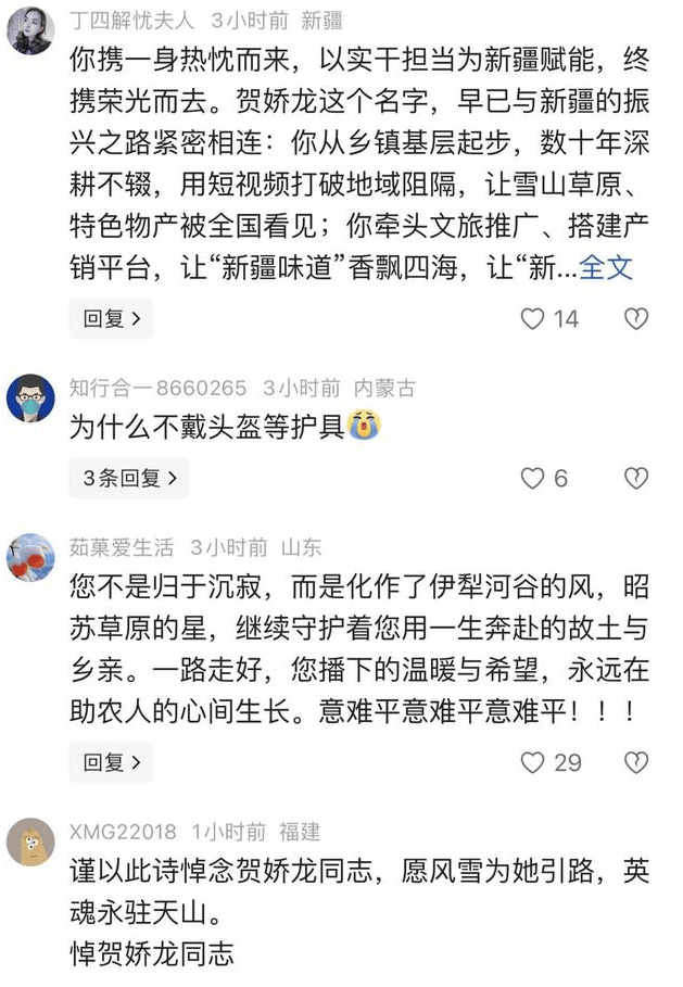 消息传来,无数网友自发留言悼念。有人写下悼诗:“红袍雪域映丹心,为爱披靡志未沉”;有人感慨她是 “伊犁河谷的风,昭苏草原的星”;更多人记得,是她用短视频打破地域阻隔,让雪山草原的壮美风光、香甜浓郁的新疆物产,走进了全国人民的视野。 ![]() 翻看她最后的朋友圈,1 月 6 日那条 “不是所有坚持都能抵御岁月,但若为热爱,便所向披靡” 的配文,如今读来更让人泪目 —— 这是她一生的写照,也是她为新疆奋斗的初心。 ![]() 贺娇龙的名字,早已和新疆的振兴紧紧绑在一起。从乡镇基层一步步走来,数十年间,她深耕三农与文旅领域,从未停下脚步。疫情期间,新疆农产品滞销、旅游行业遇冷,时任昭苏县领导的她心急如焚,毅然放下身段走进直播间。没有华丽的布景,没有专业的话术,她就用一口朴实的新疆话,对着镜头推介家乡的牛羊肉、瓜果、奶制品。没人能想到,这个 “跨界” 的局长,竟硬生生闯出了一条电商助农的新路。 ![]() 为了宣传新疆旅游,她更是豁得出去。身披红袍、脚踩马靴,在皑皑白雪中策马奔腾的短视频,让 “昭苏” 这个名字一夜爆红。可鲜为人知的是,这条几十秒的视频背后,是她数次摔下马背的伤痛 —— 曾经坠马导致的骨折和积液,从未让她退缩。 ![]() 正是这份拼劲,让她带领团队创下了年销售 2.4 亿元的亮眼成绩,累计带动各类农产品销售高达 283 亿元。那些原本可能烂在地里的农作物,经她一场直播就能变现几十万;那些藏在深闺的伊犁好物,成了全国消费者追捧的爆款;曾经被认为偏远的伊犁,也有了属于自己的电商生态圈。 ![]() 零佣金带货、公益助农,她把每一分收益都投入到乡村振兴中,自己却始终保持着共产党员的朴素本色。全国三八红旗手、全国三农人物、新疆维吾尔自治区先进工作者…… 这些荣誉,是对她实干担当的最好褒奖。在她的直播间里,在线人数常常突破百万,有人曾以为她只是个普通网红,却不知她顶着公职身份,扛起了助农兴疆的重任。 ![]() 然而,在悲痛的悼念声中,一个细节引发了网友的热议:有细心者翻出贺娇龙过往骑马的视频,发现她的踩镫方式似乎存在问题。视频里,她的脚蹬位置与正确姿势有偏差,而正确的骑马踩镫,应当以前脚掌发力,这样既能更好地掌控马匹,也能在意外发生时及时脱身。网友们痛心疾首:“这么长时间,怎么就没人提醒她一句?”“难道悲剧的起因,真的和这个细节有关?” ![]() 这个疑问,如今已无从考证。但所有人都记得,那个在雪地里策马扬鞭的身影,曾给多少人带来过力量和希望。她不是天生的网红,只是一个心怀热爱的践行者;她不是遥不可及的局长,只是一个想让乡亲们过上好日子的 “带头人”。那些她播下的温暖与希望,早已在助农人的心中生根发芽;那些她推动的文旅与电商事业,还会在新疆的土地上继续开花结果。 ![]() 未竟的乡村振兴征程,会有人替她扛;未尽的山海推广心愿,会有人替她闯。贺娇龙走了,但她留下的精神,会像天山的青松一样,永远挺拔。47 岁的生命虽短,却如流星般璀璨,照亮了新疆助农兴旅的漫漫长路。 愿风雪为她引路,愿英魂永驻天山。贺主任,一路走好! |