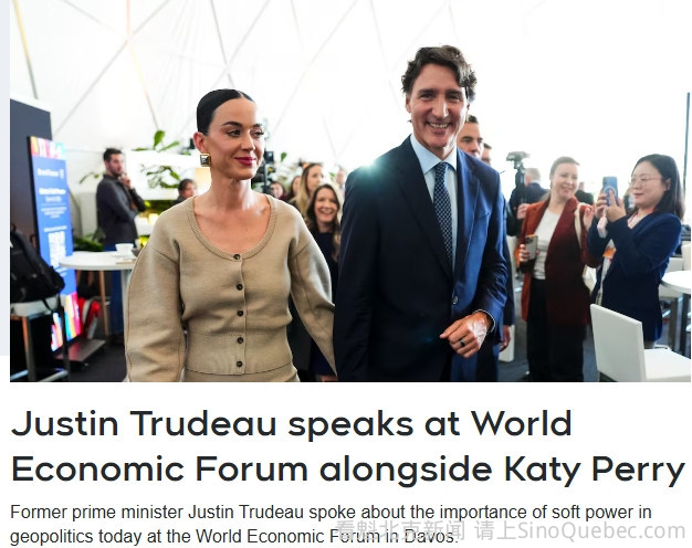 加拿大前总理杜鲁多今天在瑞士达沃斯举行的世界经济论坛上发表讲话,谈到“软实力”在地缘政治中的重要性。 他的伴侣、流行歌手Katy Perry也出现在现场,坐在前排。当杜鲁多谈到加拿大不会为了获取石油而干涉其他国家内政时,她面带微笑,神情轻松。 图源:CTV News 杜鲁多还驳斥了美国总统特朗普关于“让加拿大成为美国第51个州”的说法,表示加拿大人已经就这一问题清楚表达了自己的立场。 演讲结束后,这对伴侣迅速离开会场,没有回应试图提问的加拿大媒体记者。 世界经济论坛是在瑞士举行的一项重要国际会议,来自各国的政要以及大型企业高层齐聚一堂,讨论全球事务和经济发展议题。论坛每年在达沃斯举行,因此也常被称为“达沃斯论坛”。 据悉,等特朗普抵达后,他以及其有关吞并格陵兰的野心,预计将成为会场关注的焦点之一。