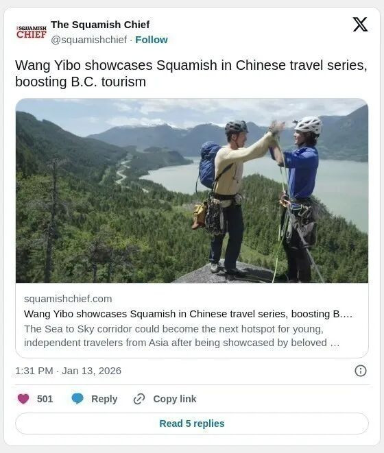相信很多华人都看了王一博今年的《探索新境2》,特别大温的华人朋友,毕竟有几集就在加拿大的攀岩胜地--大温附近的斯阔米什(Squamish)。里面还有著名的美籍华裔纪录片导演金国威。 近日,BC省旅游局也盖章印证,得益于中国超人气明星王一博的推广,不久的将来,预计更多中国游客可能会来到BC省(B.C.)的斯阔米什(Squamish)观光旅行。 ![]() B.C. 旅游局(Destination BC)中国分部与户外纪录片系列《跟随王一博探索未知》(Exploring the Unknown with Wang Yibo 第二季)合作,通过该节目向数百万亚洲观众展示斯阔米什的自然风光和户外体验。 ![]() 王一博,28岁,是演员、歌手、舞者,同时也是职业摩托车赛手,曾为男子组合 UNIQ 成员。他在纪录片第三至第六集的拍摄地均为斯阔米什,节目中他挑战了烟雾峭壁公园(Smoke Bluffs Park)的辅助攀岩与法式自由攀登、深水攀岩、立式桨板、飞盘高尔夫和海钓等多种户外项目。 ![]() 王一博在斯阔米什拍摄期间,人品爆棚,划板还偶遇鲸鱼。 ![]() ![]() 去年八月,社交媒体上曾出现疑似王一博在当地活动的目击信息,包括在始祖鸟攀岩学院(Arc’teryx Climbing Academy),但制作团队一直保持官方低调,直到去年秋季节目播出。 B.C. 旅游局市场开发经理莫妮卡·李克(Monica Leeck)表示,这次合作对BC省旅游来说意义重大,也是推广海天走廊(Sea to Sky)及斯阔米什全年旅游潜力的好机会。 她说:“斯阔米什是一年四季的旅游目的地,适合不同类型的游客。王一博的节目预计会吸引更多年轻、独立型游客。同时,斯阔米什及周边还有许多付费景点,如海天缆车、斯阔米什峡谷等,非常适合小团体或家庭出行”。 《跟随王一博探索未知》由腾讯视频与华纳兄弟探索联合制作,第二季于2025年11月28日在腾讯视频独家首播。据B.C. 旅游局透露,节目上线30分钟内登顶多项热度榜,并在8小时内突破一亿次观看。该系列今年还将通过探索频道(Discovery TV)进行国际发行。 李克提到,过去中国游客一直是B.C.旅游的重要客源:“疫情前,中国是我们最大的海外客源市场,仅次于美国。随后由于地缘政治紧张和疫情,市场受限,但近期已逐步开放。航班运力也在改善,目前约为疫情前的50%”。 她还表示,2025年11月3日,中国已将加拿大重新列入团体旅游批准名单,为吸引更多国际游客提供了机会。 斯阔米什当地非营利旅游管理组织(Tourism Squamish)发言人尼基·约翰斯顿(Nikki Johnston)表示,斯阔米什获得全球曝光令人振奋,凸显其户外探险项目的国际吸引力。 她指出,住宿游客约占当地游客总消费的80%,在住宿期间更可能光顾餐馆、参加导览、参观景点及购物,因此鼓励国际游客延长停留时间、引导一日游客深度体验当地,是该组织的重要目标。 约翰斯顿表示,企业和居民可引导游客前往斯阔米什探险中心(Squamish Adventure Centre),提供可信的推荐、行程规划支持及友好接待。同时,商家可通过清晰标识、便捷Wi-Fi、耐心沟通和开放回答问题等方式,让游客感受到舒适与信任。 李克强调,旅游局也在考虑“分流”游客的问题,推广在淡季出行的活动,尤其适合中国游客,例如春节(2-3月)及秋季节(10月)期间。她还提到,墨西哥游客偏好在秋、冬、春出行,这与斯阔米什淡季旅游非常契合。 此外,2026年世界杯期间,中国球队虽无法参赛,但球迷关注赛事的热情将为BC省带来宣传机会。李克表示:“这是提升B.C.国际知名度的好时机,有助于未来吸引更多游客”。 B.C.旅游局计划在未来几个月推出针对中国游客的本地接待指南,涵盖历史、文化、旅游信息及注意事项,并提供简单易懂的中文信息与翻译,帮助商家和居民更好接待中国游客。 斯阔米什和B.C.旅游部门表示,欢迎来自中国及全球的游客,以包容、尊重和真诚好客的方式体验斯阔米什的自然与文化。 |